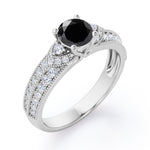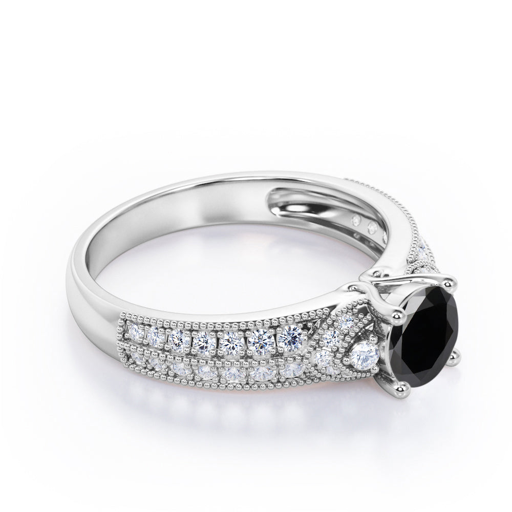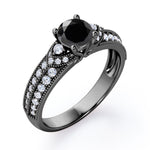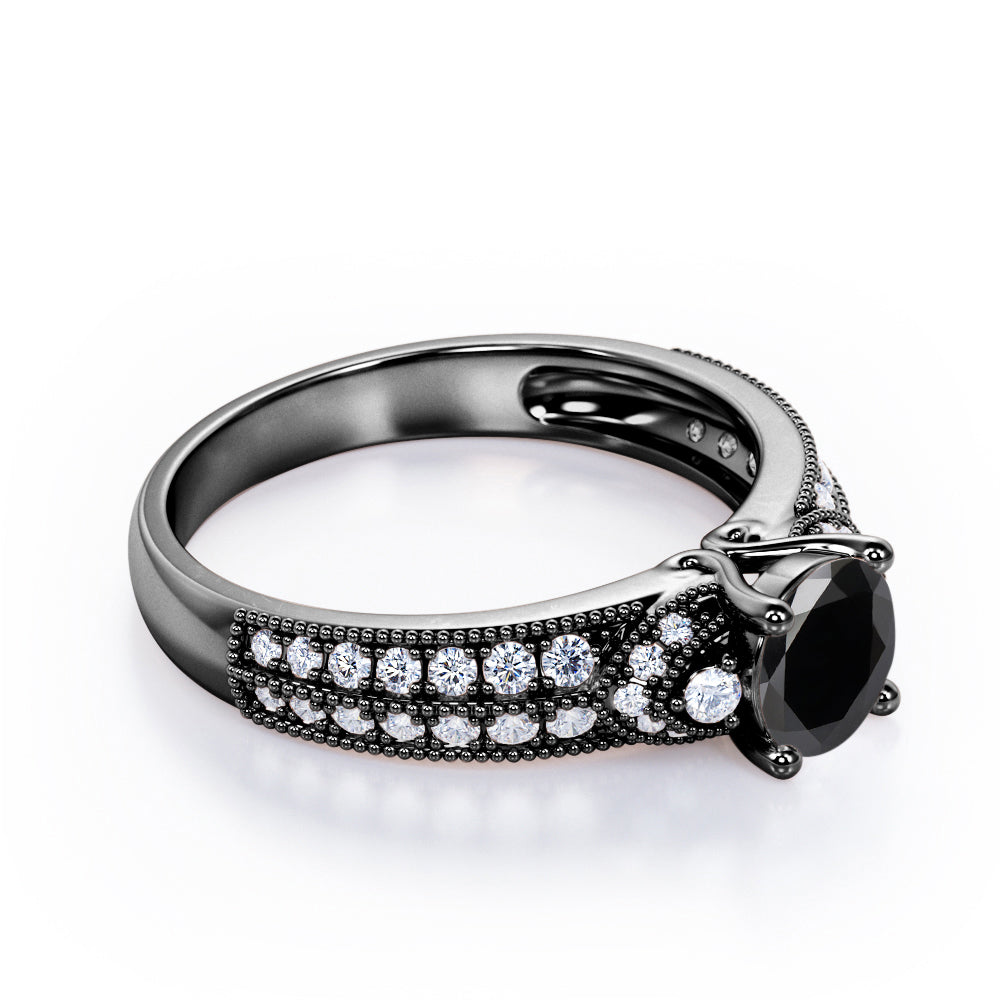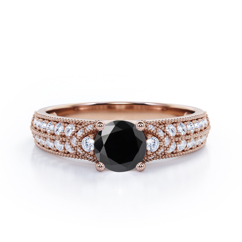 Simple Four Prong 1.50 Carat Round Cut Black Diamond Vintage Milgrain Multi Row Engagement Ring In Rose Gold. For the bold bride out there, we have got the one of a kind ring you've been searching for. Check out this stunner with a brilliant round black diamond of 1 carat accented by 0.50 carat glistening set of white diamonds all over the band. The vintage-inspired design is complemented by a vintage style thick layered wedding band embedded with antique milgrain all over in rose gold. The vintage milgrain work all over the band gives this gorgeous black diamond engagement ring an antique feel. This vintage beaded engagement ring is an epitome of timeless. Handmade with utmost love and sincerity, this simple four prong 1.50 carat round cut black diamond vintage milgrain layered engagement ring in rose gold for her can also be customized to 10k Gold or 14k Gold as you like. Press the add to cart button now to make it all yours.