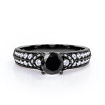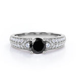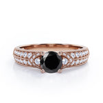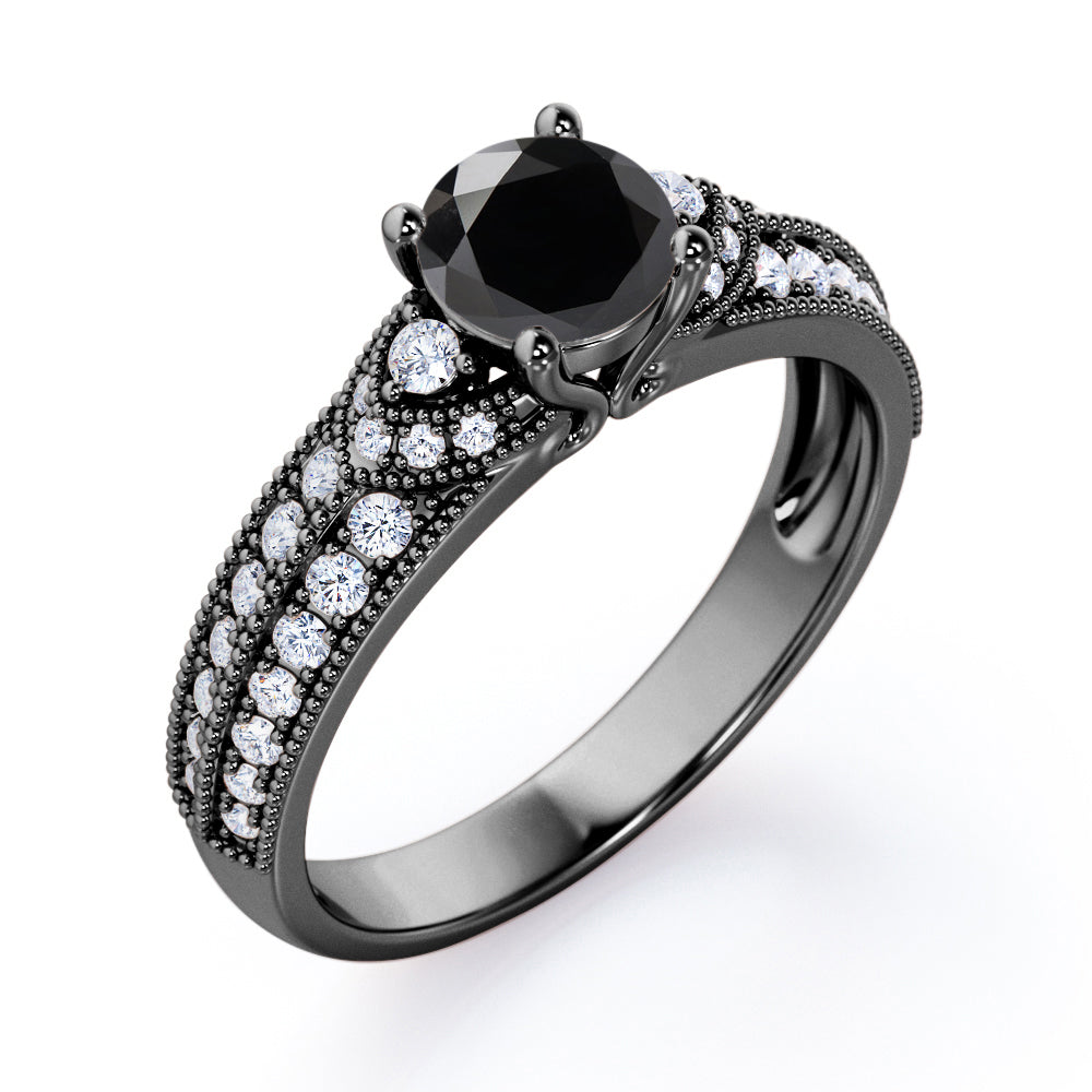 Simple Four Prong 1.50 Carat Round Cut Black Diamond Vintage Milgrain Multi Row Engagement Ring In Rose Gold