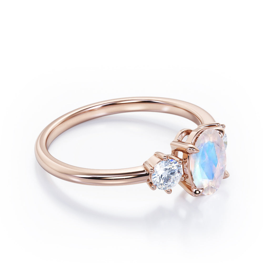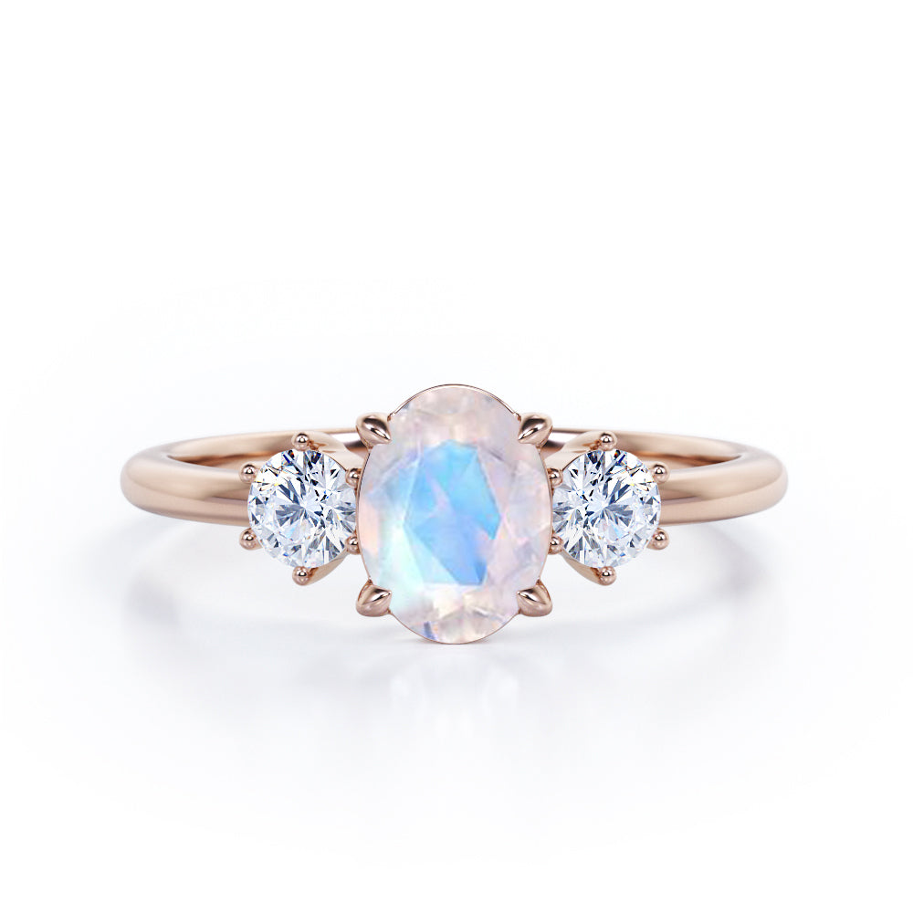 Simple Trio Stone 0.8 carat Oval Moonstone and Diamond Engagement Ring in Rose Gold