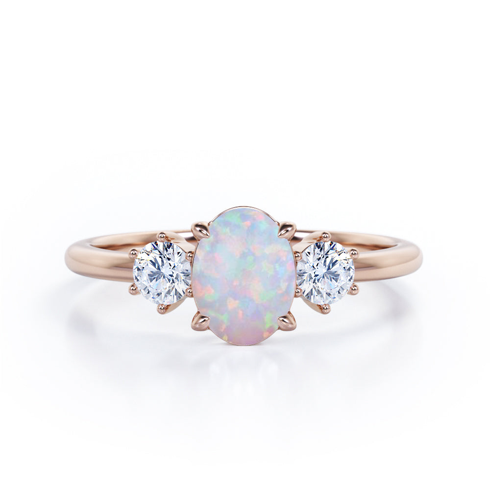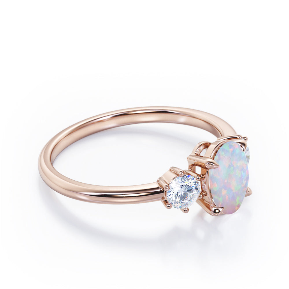 Classic but elegant. A Simple Trio Stone 1.1 carat Oval lab Lab Created Opal and diamond Engagement Ring in Rose Gold. The promise ring features a 1 carat oval lab Lab Created Opal and it is flanked by two round diamonds; one stone on each side. Side stones even add more sparkle to the ring and compliment the center stone perfectly. This Lab Created Opal engagement ring is a perfect proposal ring that is very beautiful and classy. You can also choose the color that would fit your lover's personality most. Available for you to choose in white gold, rose gold and black gold. You can also choose either 18k gold over silver, 10k gold or 14k gold to be your metal.
