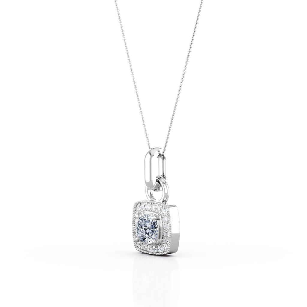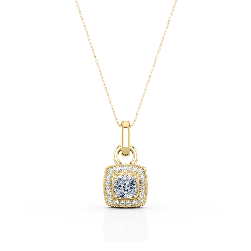 Single Bail Half Bezel 1.1 Carat Cushion Cut Certified Moissanite and Diamond Surface Prong Pendant Necklace in Yellow Gold