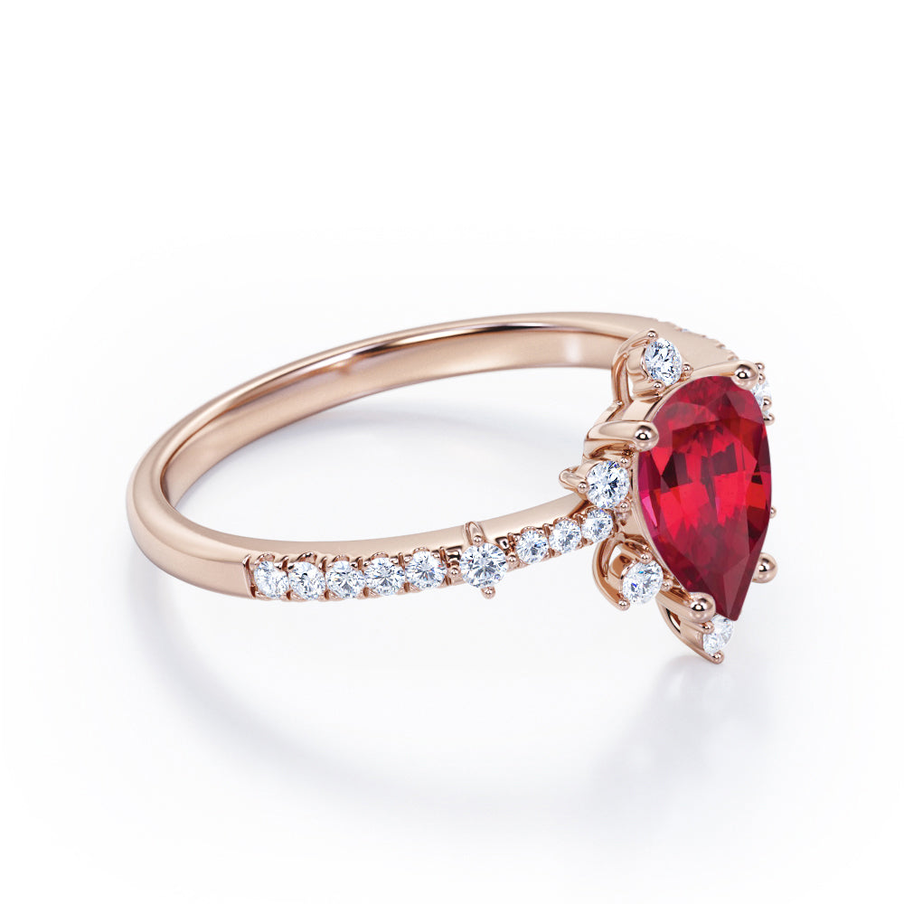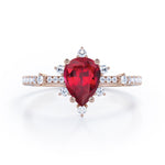 Every snowflake has their own unique pattern as well as each proposal ring. Maybe the design is the same but with different shape, the ring looks like another one. A Snowflake 0.7 carat Pear Lab Ruby and Diamond Classic Engagement Ring in white Gold showcases a 0.5 carat pear Lab Ruby in the center and ornamented with round diamonds that alternating with prongs that hold the center stone, creating the edge that seems like a spreading ice. Half of the band is filled by round diamonds and with one lightly larger size in the middle to break down the classic design. This promise ring can be made in 18k gold over silver, 10k gold and 14k gold with the color of white gold, rose gold, yellow gold and black gold.