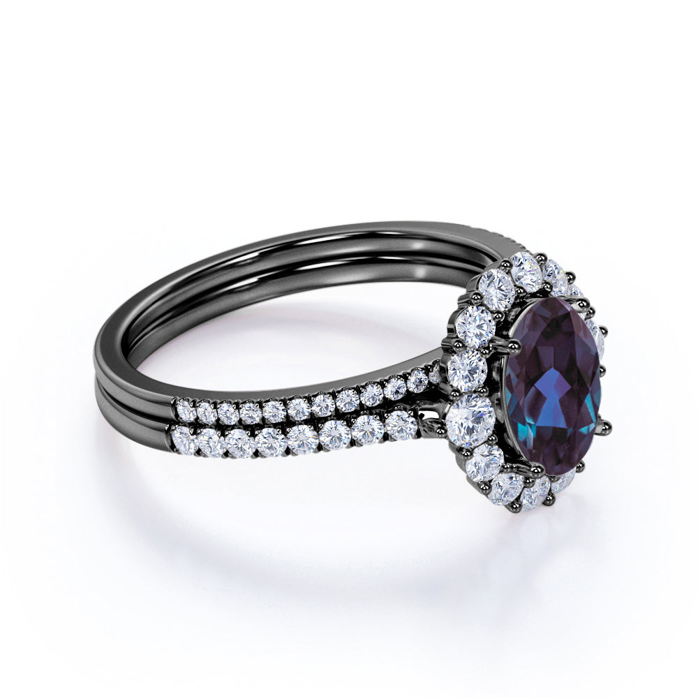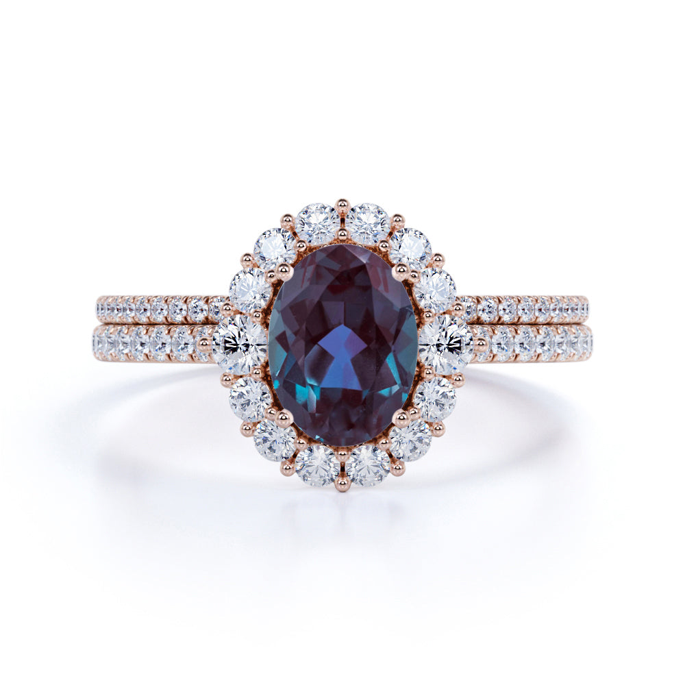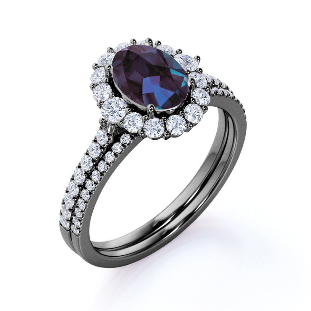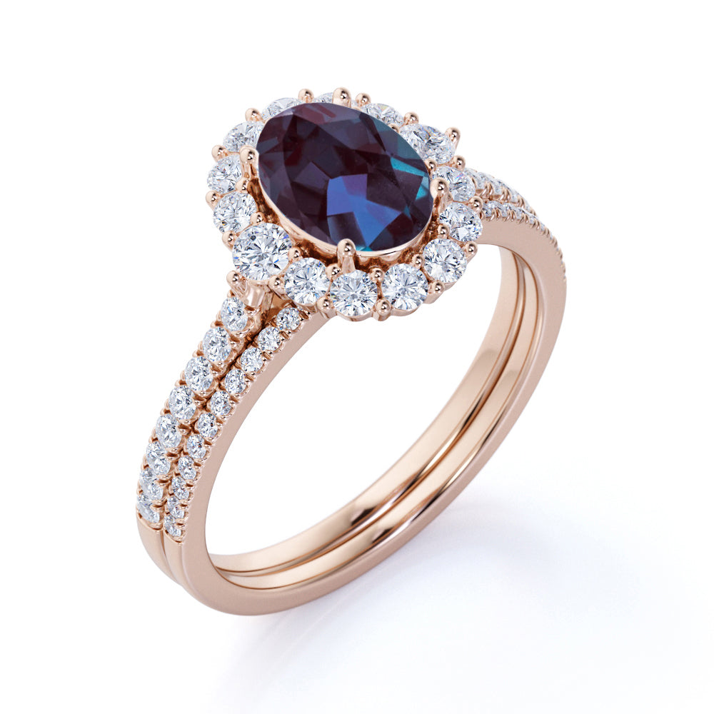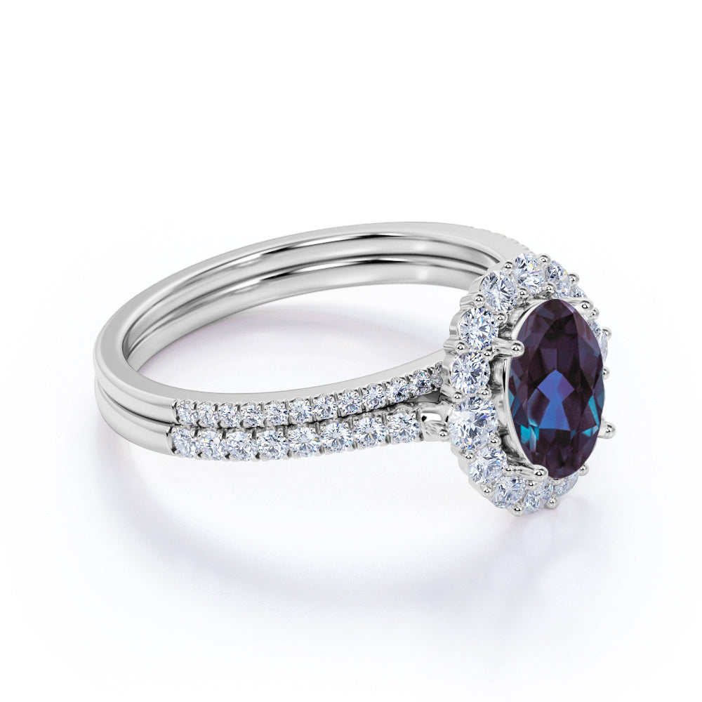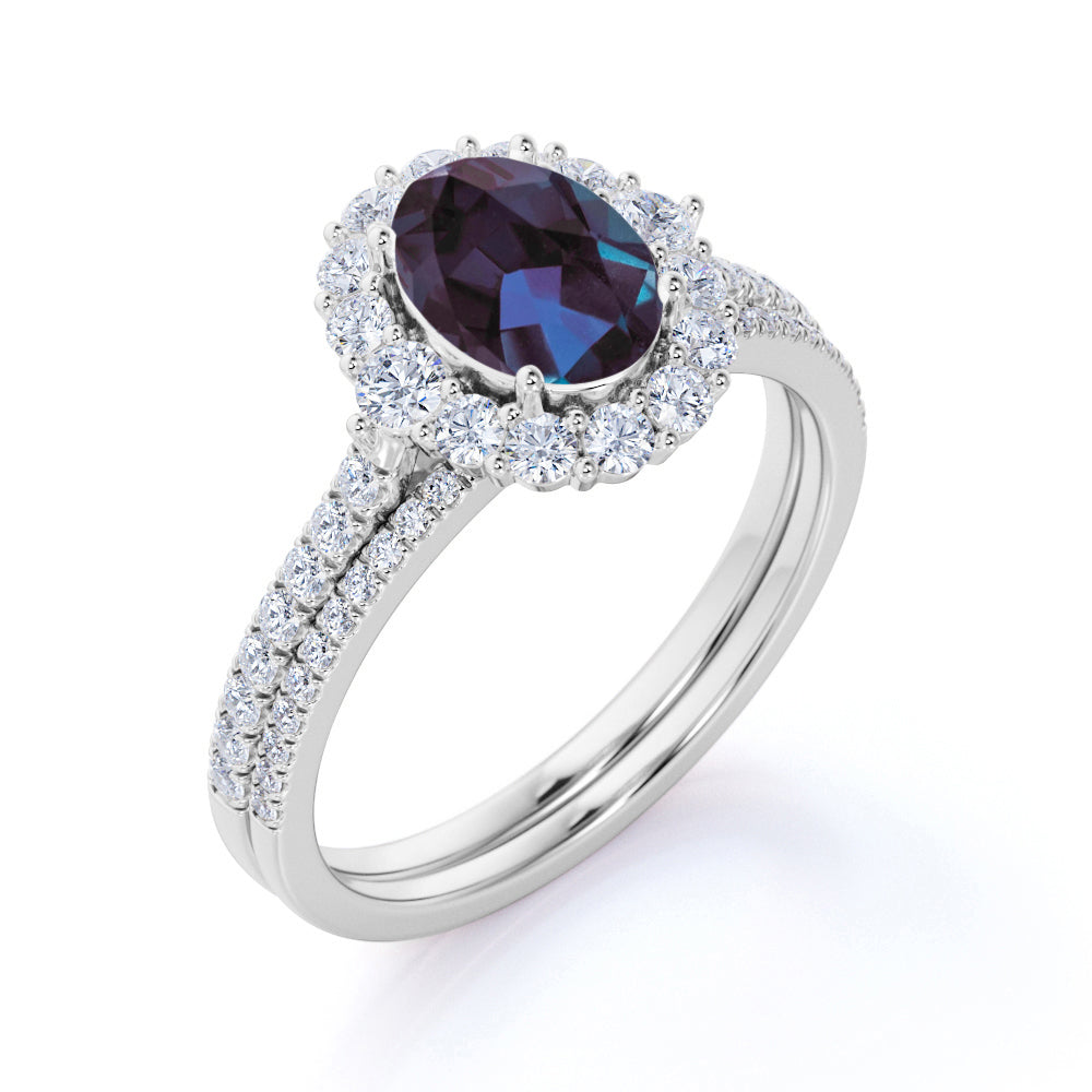 Snowflake Halo 1.75 Carat Oval Cut Simulated Alexandrite and Diamond Pave Bridal Set Rings