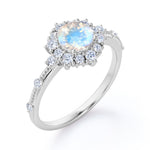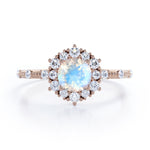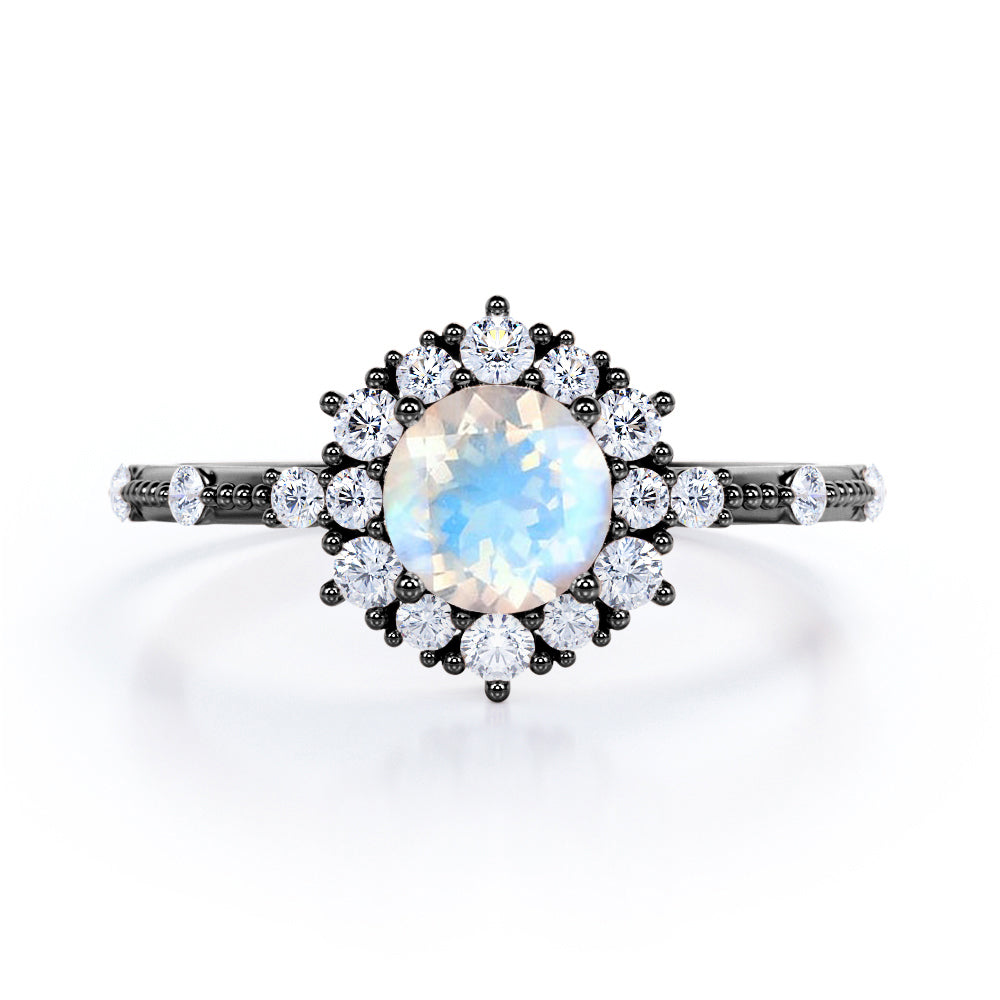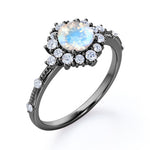 Snowflake Inspired 0.6 carat Round Moonstone and Moissanite Engagement Ring in Black Gold