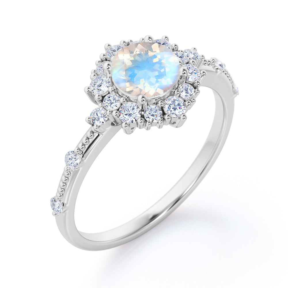 Put a little chill to your total look with the Snowflake Inspired 0.6 carat Round Moonstone and Moissanite Engagement Ring in Black Gold. The promise ring presents a 0.5 carat round Moonstone among the round Moissanite halo; petite Moissanite are placed side by side in shared prongs. Dainty band is filled by Milgrain and round Moissanite scatter around. Bead decoration makes the ring become more vintage and its well polished band can be made in 18k gold over, 10k gold and 14k gold with the color of white gold, rose gold, yellow gold and black gold.