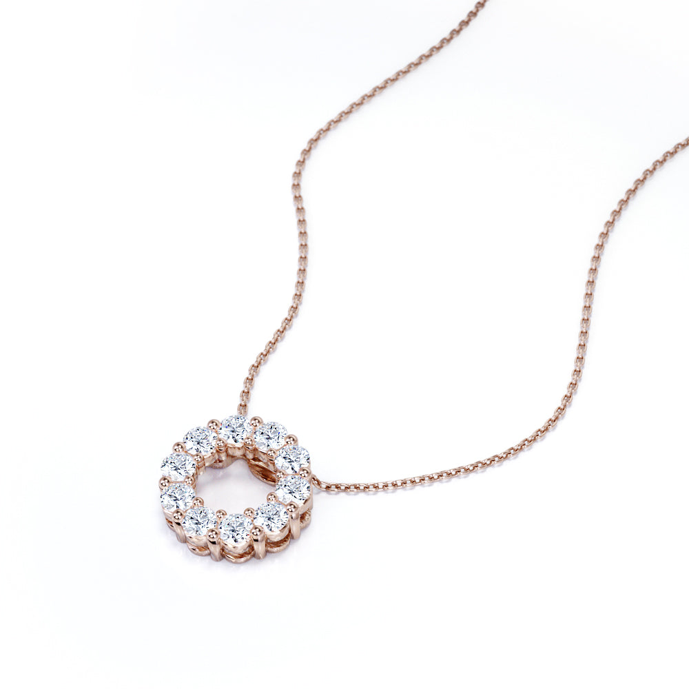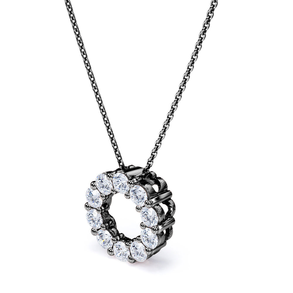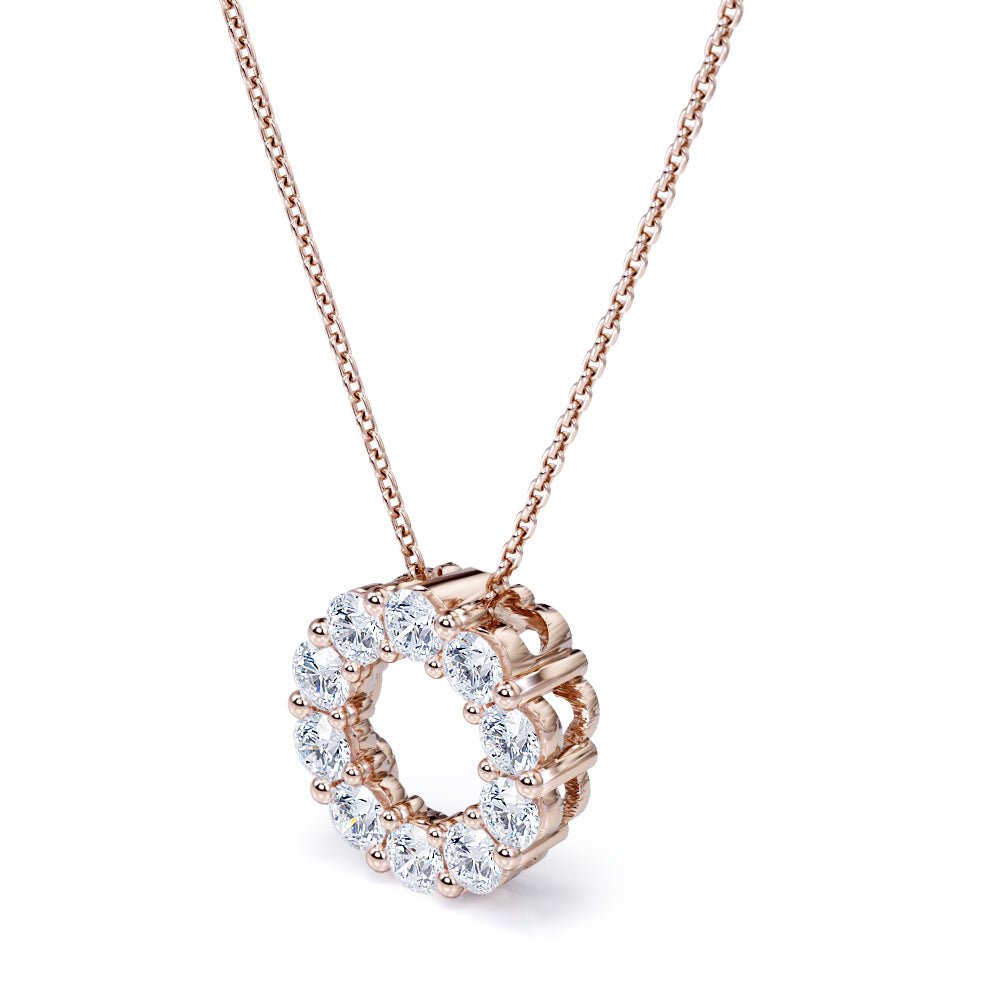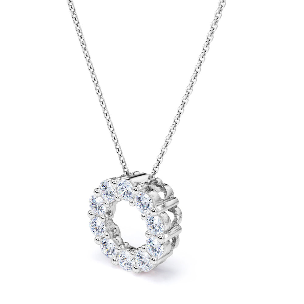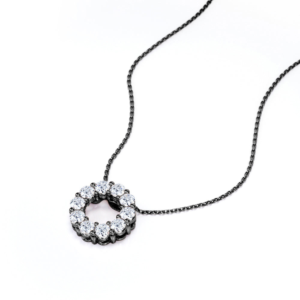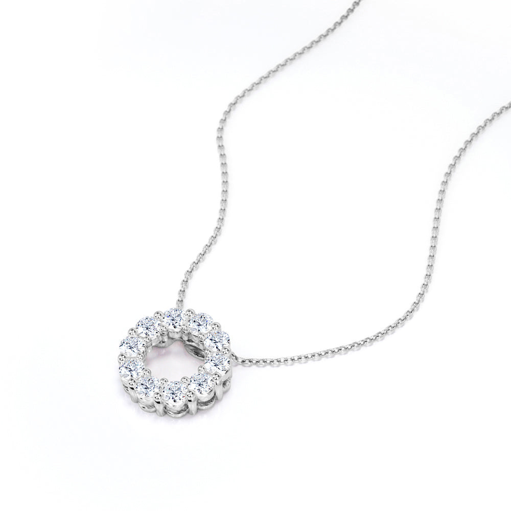 Snowy Round Wreath 1.10 carat Round Moissanite Pendant Necklace in 18k White Gold Over Silver features 10 stones of Moissanite. Each stone is placed next to each other in shared prongs and formed into a round but the rhythm of round stones and smaller round prongs make the edge look curvy like a flower wreath. With the clear sparkle properties of the stones, this pendant gives a vibe of the white Christmas. A snow piece that you can carry with you everywhere you go. If you look from the side, you will see another line of metal at the bottom of this classic pendant; placed in a parallel manner with a space between, to make the pendant become a beaded bail itself so there will not be any additional part showing up on top. This necklace in made in silver with 4 colors that you can choose; white gold, rose gold, yellow gold and white gold.