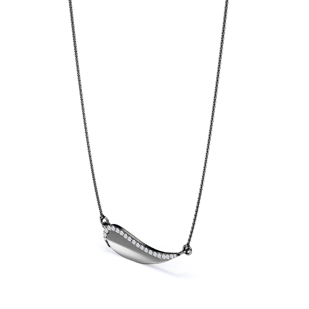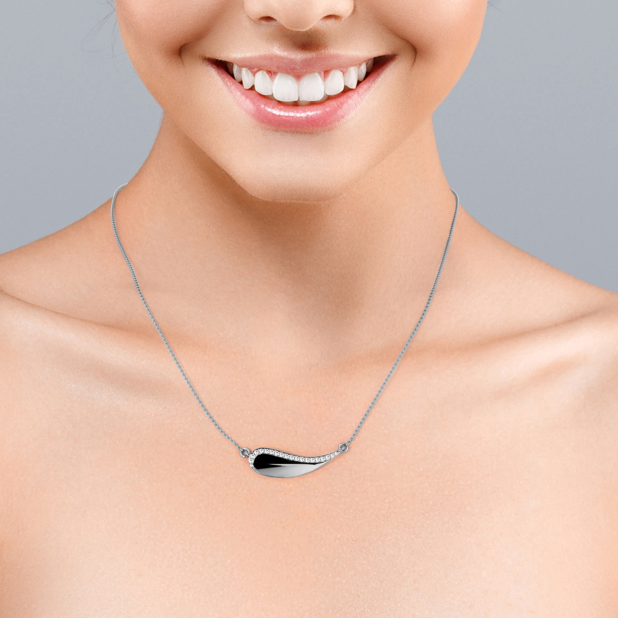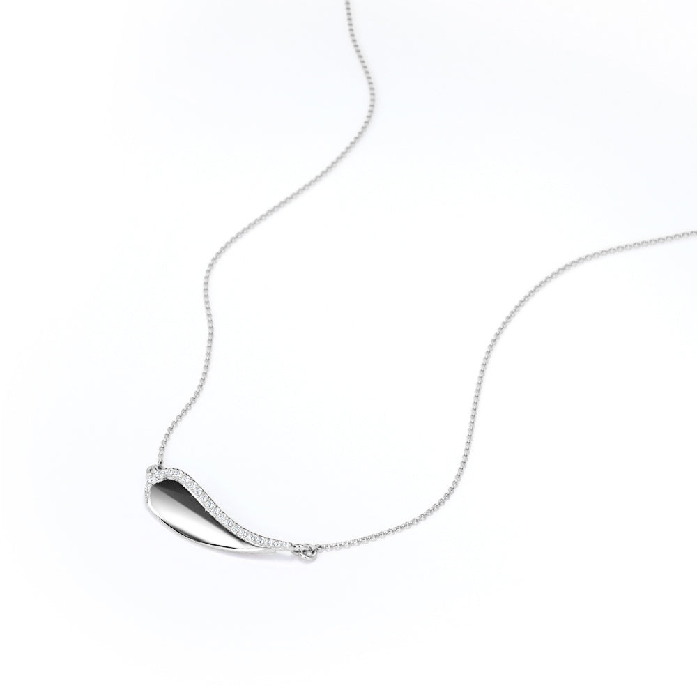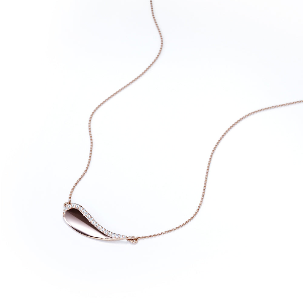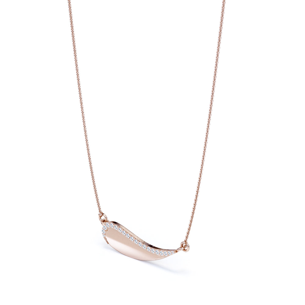 Paint and create your own adventurous story with your new lucky charm, a Solid Curved 0.15 carat Round Moissanite Pendant with 18k Rose Gold Over Silver Chain Necklace. The silver pendant is made into a curvy shape that looks like the head of a paintbrush but also looks like a wave that is moving toward the shore. Even the jewelry can be seen differently, so can oneself. Let this be a reminder to yourself that people might judge you, but the only thing that you should be better at is your old self. The pendant is edged with round Moissanite by half of it, or it can be changed to diamond as well. Pick whichever one that fits you most. It can also be a perfect gift for your special one on their birthday, mother's day, or graduation.
