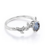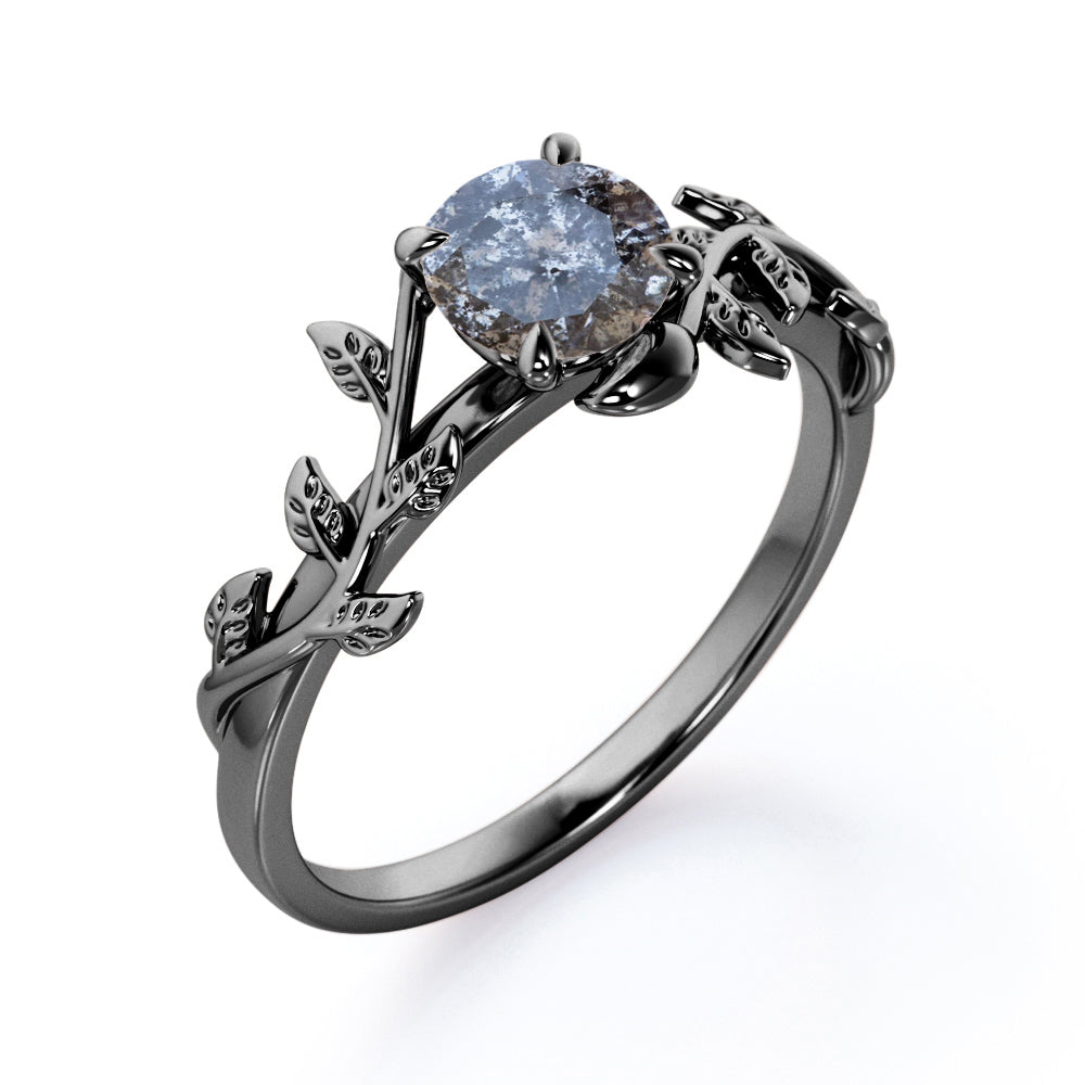 Solitaire 0.50 Carat Round Cut Genuine Icy Dark Grey Salt and Pepper Diamond Nature Inspired Engagement Ring In White Gold. Showcasing our exclusive new addition to Salt and Pepper diamond engagement rings collection, which is very unique and perfect for a modern-bride-to-be that loves nature and diversity. Inspired by nature, this charming ring is intricately carved and crafted into delicate leaf and vines that run flawlessly along the fingers. This floral solitaire engagement ring features 0.50 carat of salt and pepper diamond as the center stone which is held firmly by the four claws. Take the natural feeling of a raw diamond engagement ring to the next level with a botanical-inspired setting of gilded twigs and leaves. Handmade with love and care by our experienced craftsmen, this solitaire 0.50 carat round cut natural salt and pepper diamond nature inspired engagement ring can also be customized to 18k Gold plating over silver, 10k Gold or 14k Gold as you desire. So, wait no more just click the add to cart button now to make this regal piece all yours.