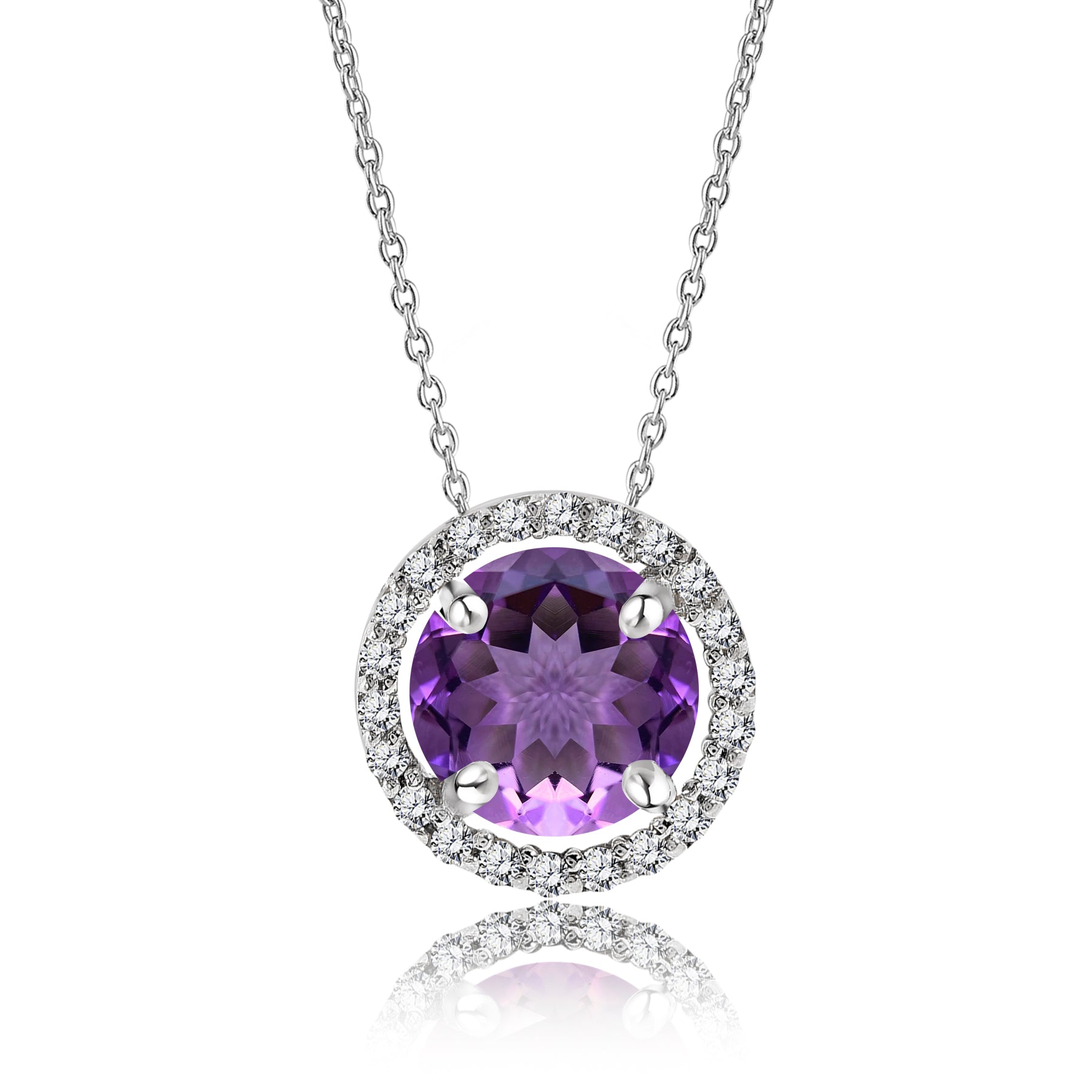 Solitaire 1 Carat Round Cut - Amethyst - February Birthstone Halo Pendant Necklace 18k White Gold plating over Silver, Adult, Female