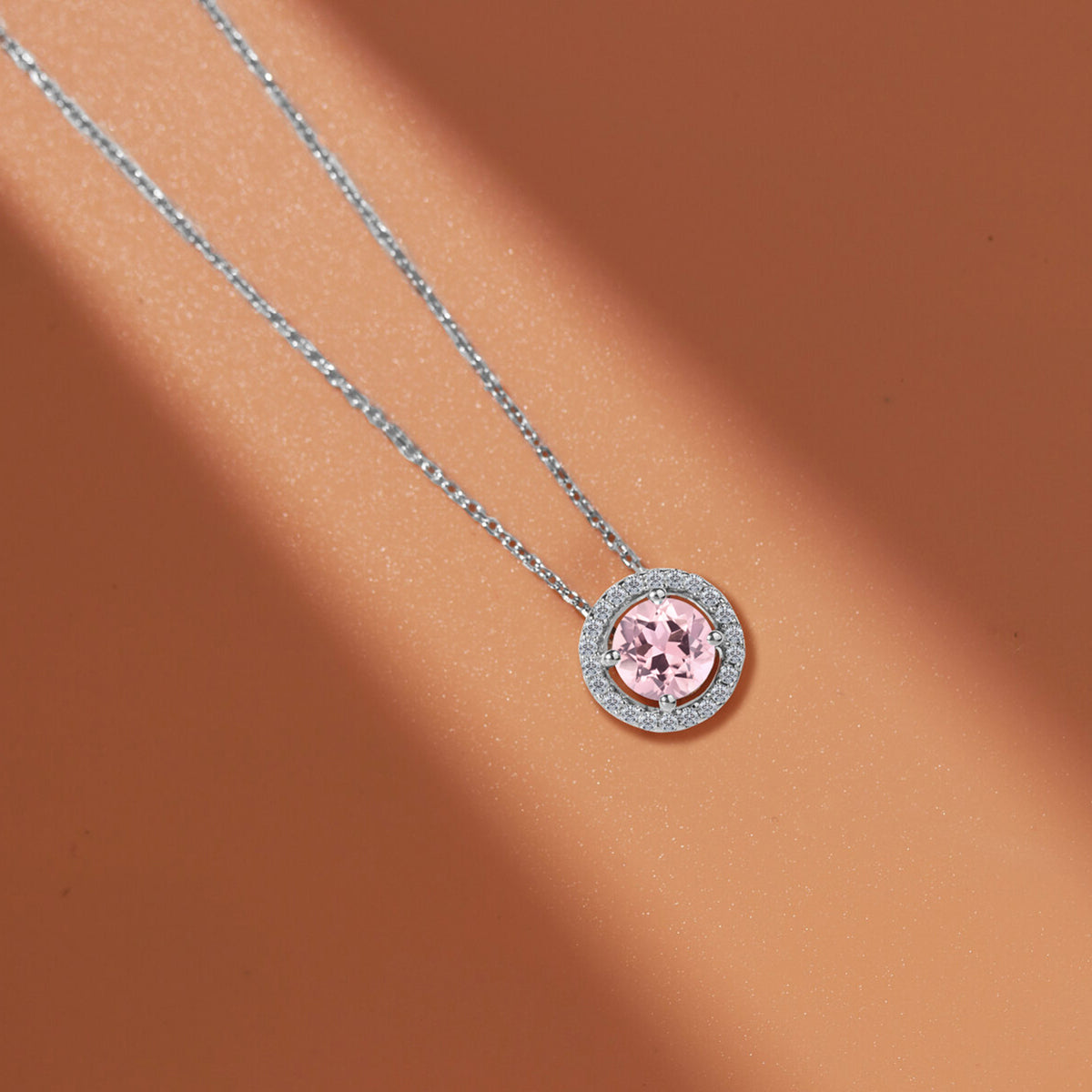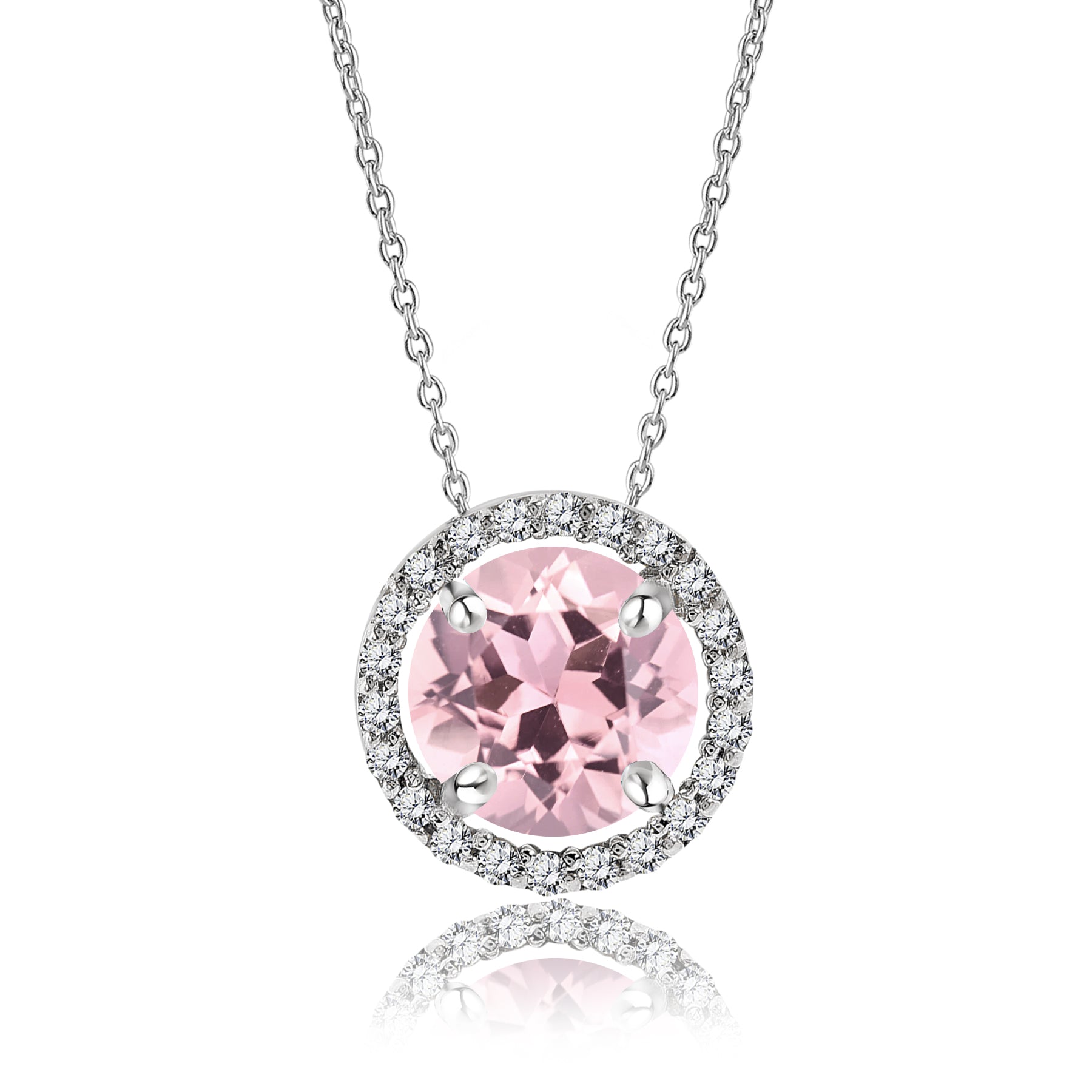 Solitaire 1 Carat Round Cut - Pink Tourmaline - October Birthstone Halo Pendant Necklace 18k White Gold plating over Silver, Adult, Female