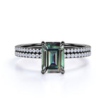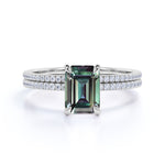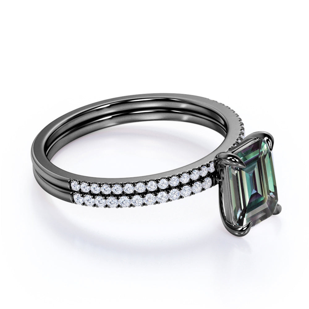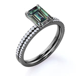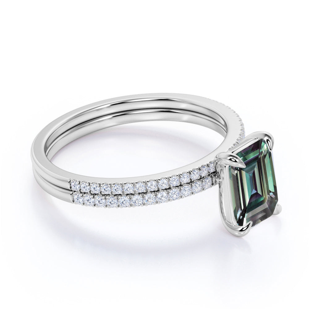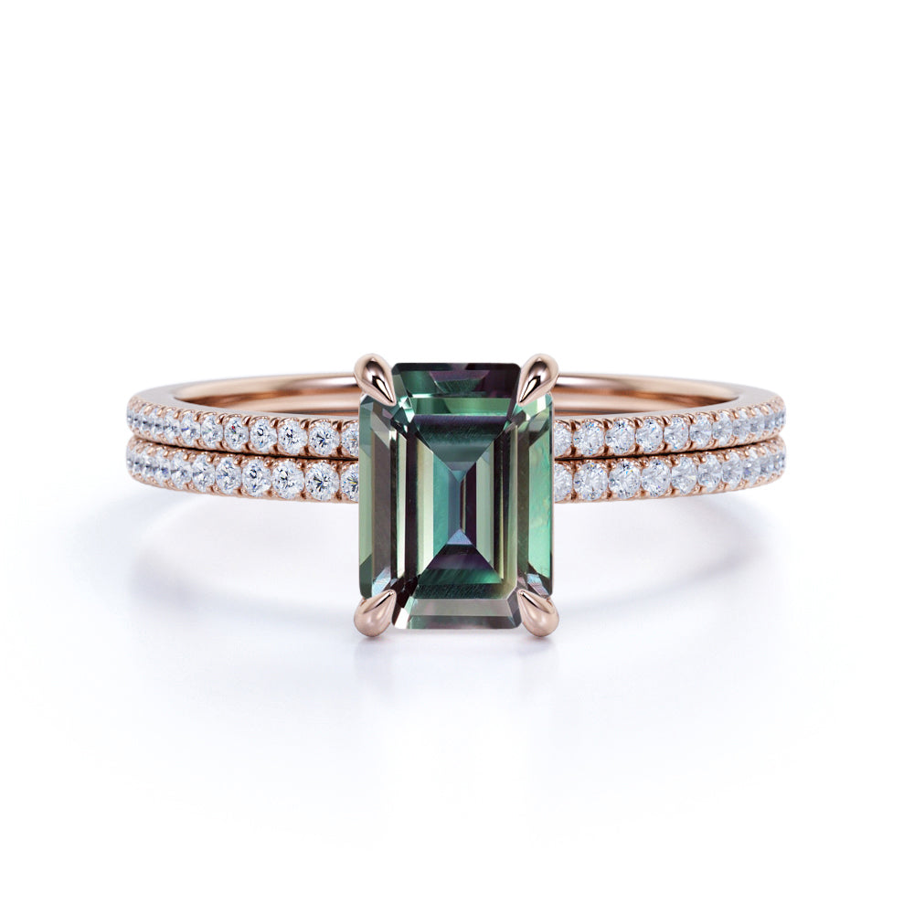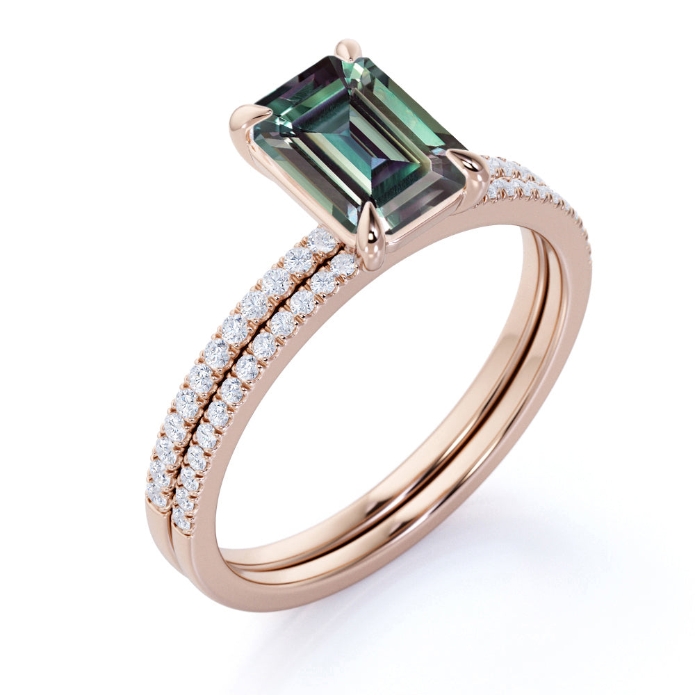 Solitaire 4 Claw 1.50 Carat Emerald Cut Lab Made Alexandrite and Diamond Pave Wedding Ring Sets