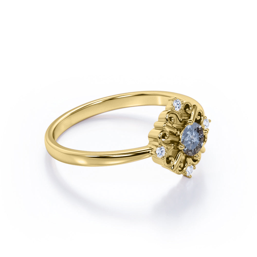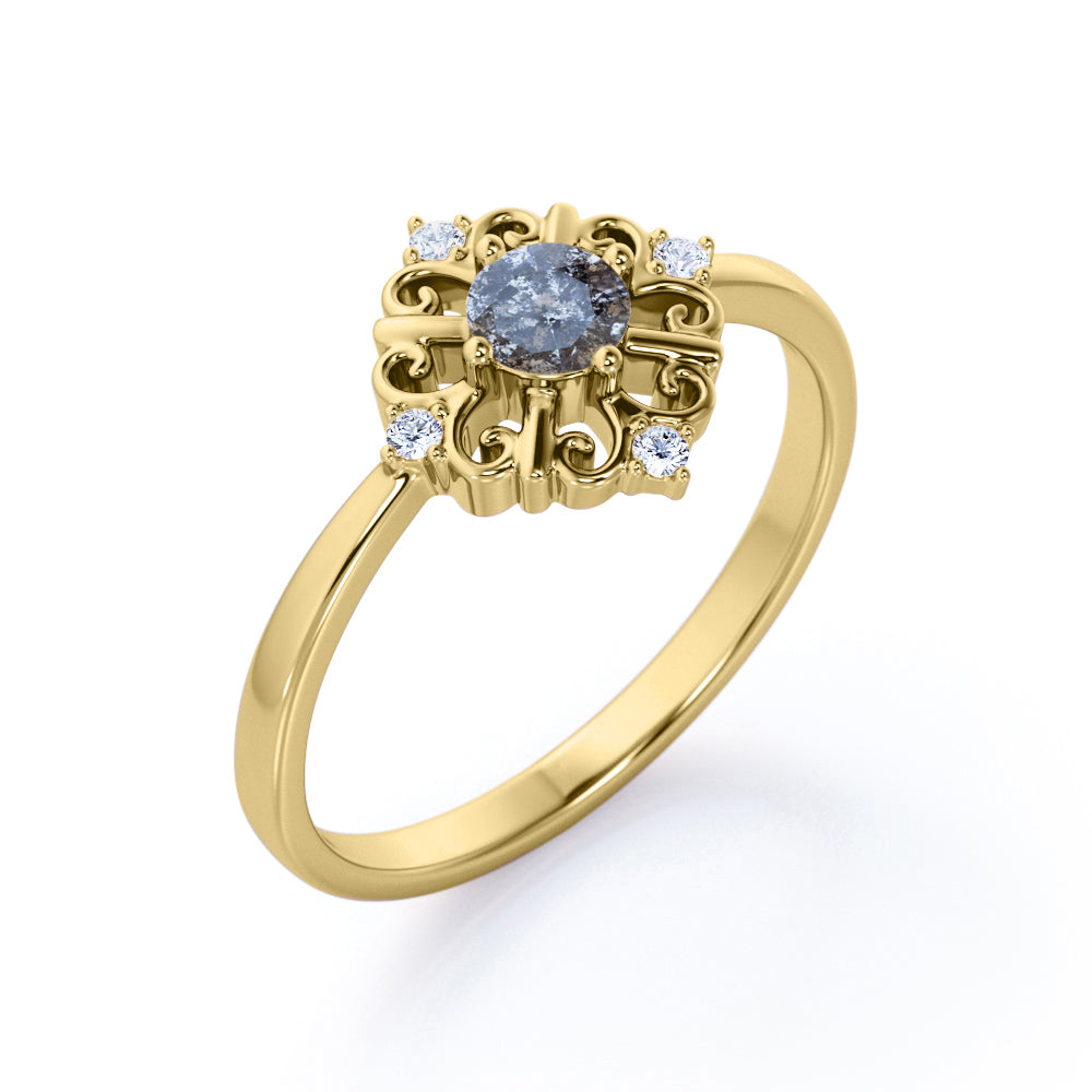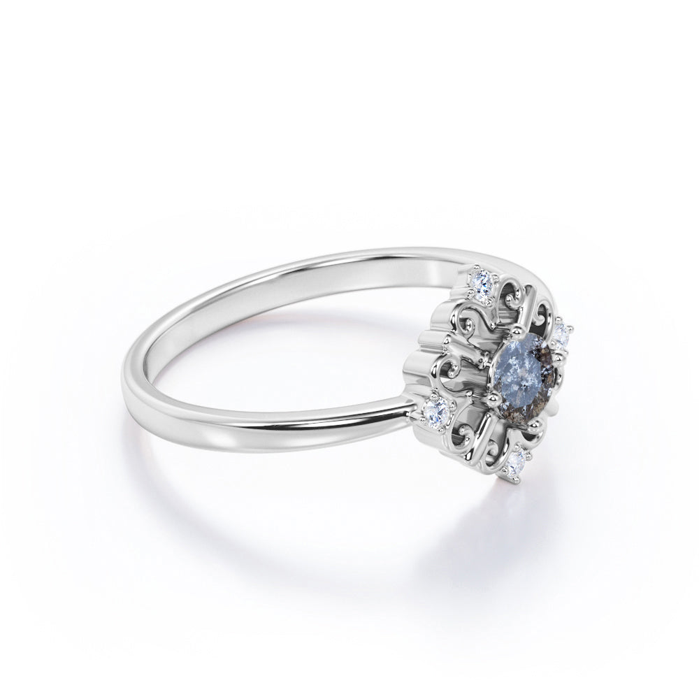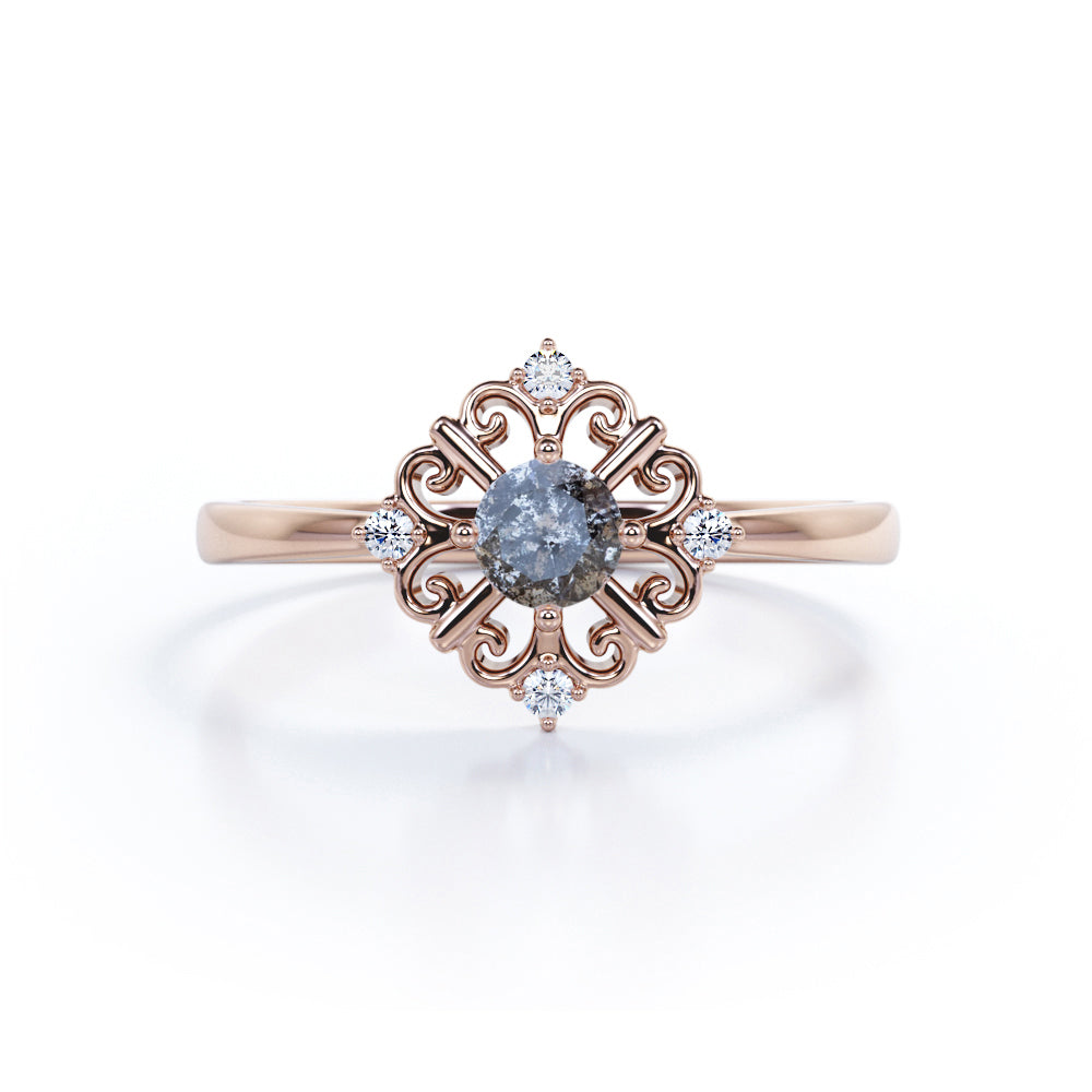 IMPORTANT NOTE: Since each Salt and Pepper Diamonds is one of a kind, the actual color of it may vary from the one that is pictured above. Thanks to its enchanting black and white inclusions, this Solitaire Floral Outline 0.60 Carat Round Cut Icy Black Grey Salt and Pepper Diamond Plain Shank Engagement Ring will be as unique as its wearer. This floral filigree ring features .50 carat round cut natural Salt and Pepper Diamond and .10 carat real side Diamond for gold ring and Moissanite for silver ring. This exquisite engagement ring can be customized to either 10k, 14K and Gold over Silver and either Black Gold, Rose Gold, White Gold or Yellow Gold. Also, as your satisfaction is our most priority, we will do our best to have your handmade jewelry be carefully and beautifully crafted by our expert jewelers. The order also comes with a 30-day full refund policy. Due to its unique appearance, this ring will be a distinctive gift for all special occasions. With its unique appearance, you can be sure that no any other rings will look exactly alike. If you are looking for alternate gemstone, this Salt and Pepper Diamond is right for you. It provides an ideal way to stand out from crowd with a gorgeous and distinctive ring. Being considered a very eccentric gemstone, this ring will create a timeless and fabulous engagement ring. Create a fascinating look on your finger with this Salt and Pepper Diamond ring for women which is available in both solid gold and sterling silver. Sparkle your finger with this ring which is perfect for any occasion and everyday wear. Its inclusions reminds us that beauty doesn't always lie in perfection. Handcrafted with love, this antique ring will complement any style and enhance the charm of its wearer.