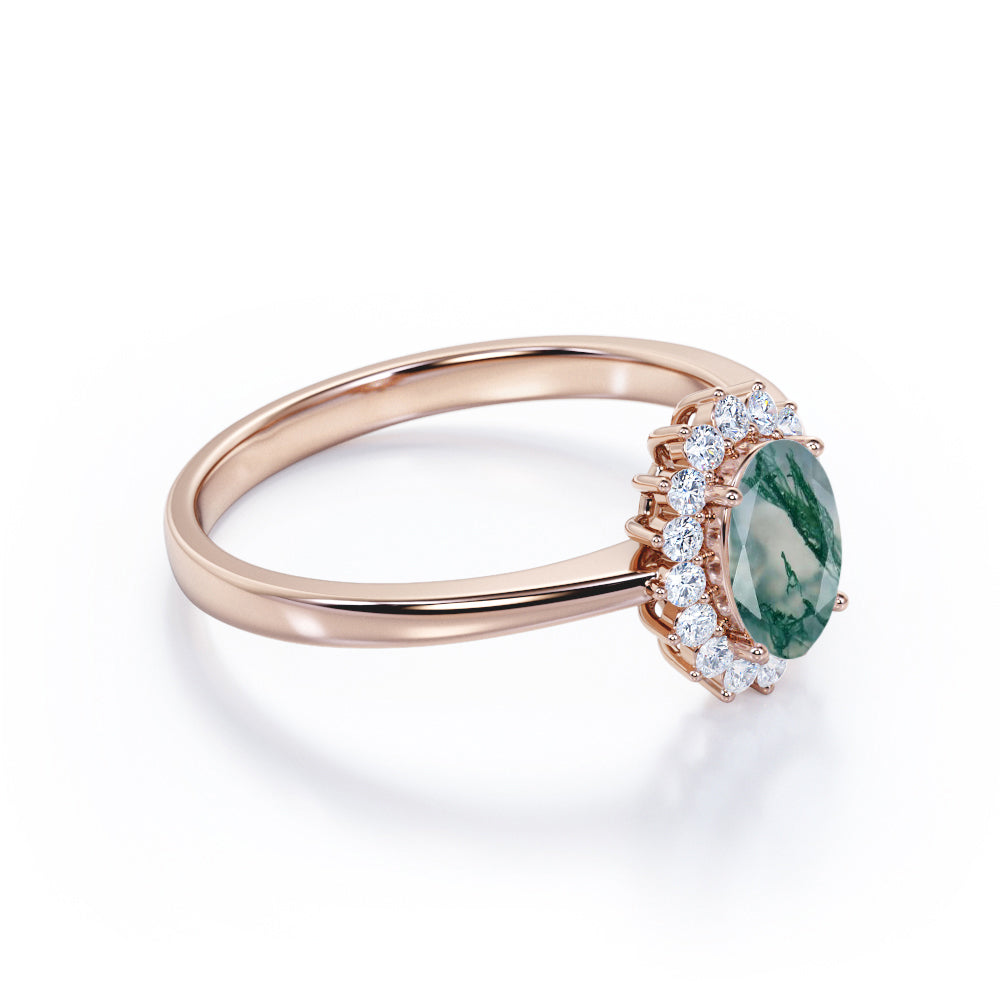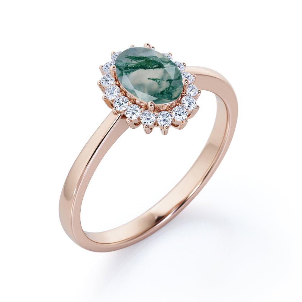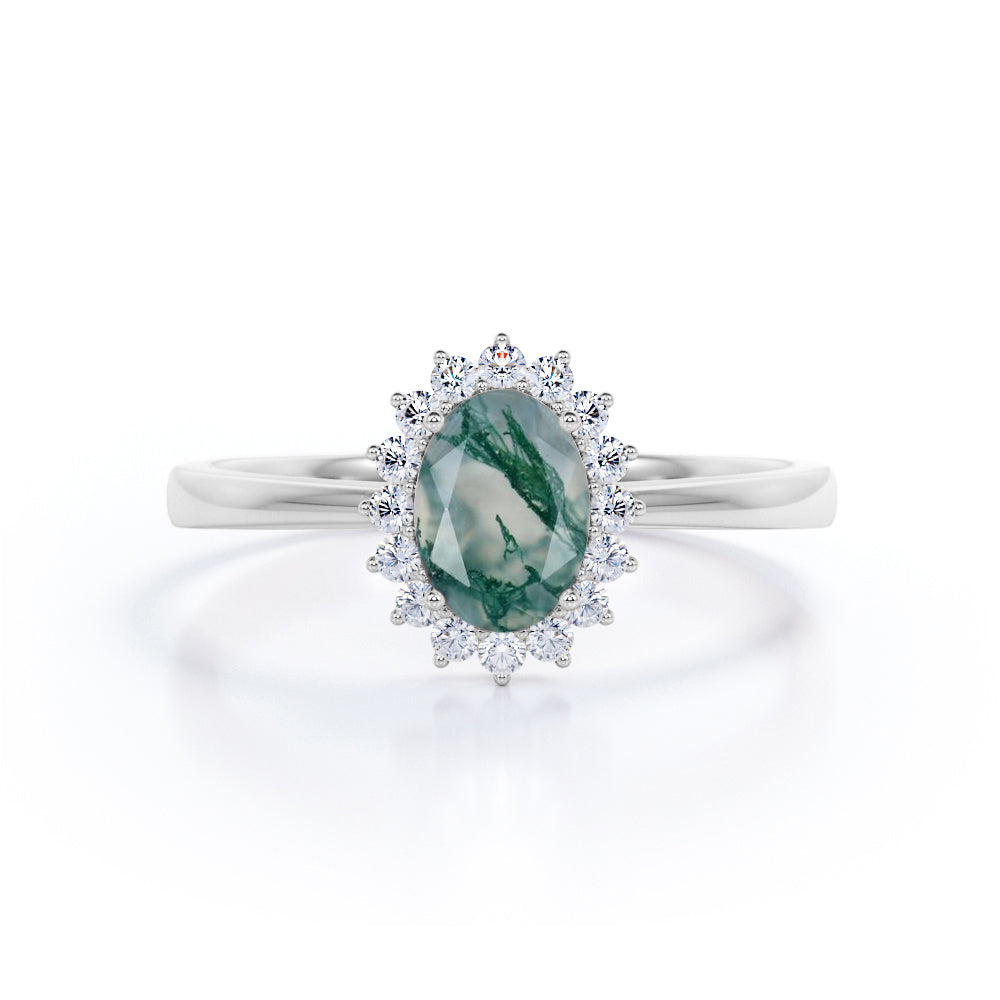 Solitaire Snowflake Style 1.25 Carat Oval Cut Milky White Moss Green Agate and Diamond Halo Engagement Ring