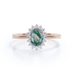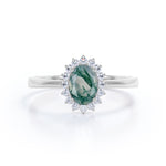 Solitaire Snowflake Style 1.25 Carat Oval Cut Milky White Moss Green Agate and Diamond Halo Engagement Ring