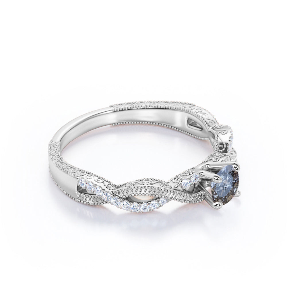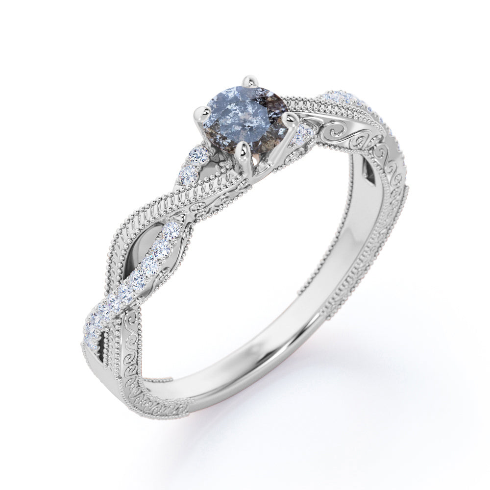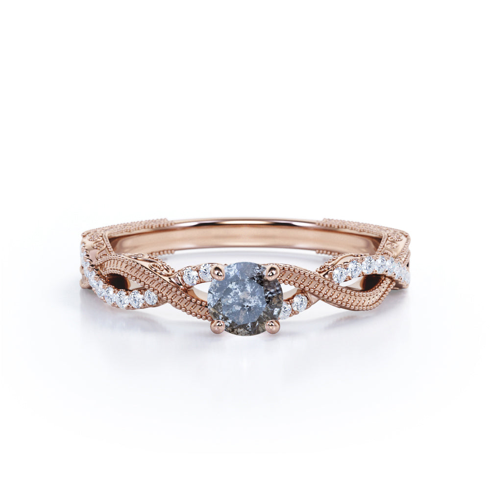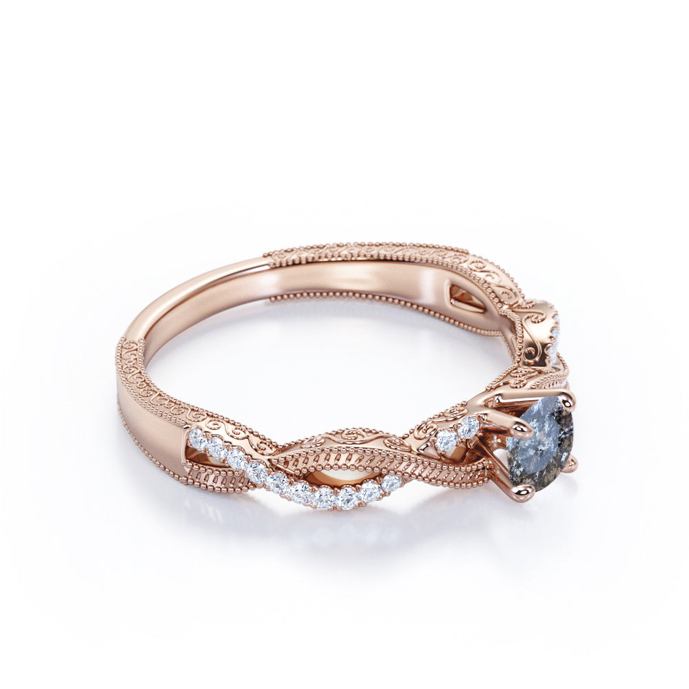 IMPORTANT NOTE: Since each Salt and Pepper Diamonds is one of a kind, the actual color of it may vary from the one that is pictured above. Thanks to its enchanting black and white inclusions, this Solitaire Twisted Infinity 0.75 Carat Round Fancy Dark Grey Salt and Pepper Diamond Surface Prong Milgrain Vintage Engagement Ring in Rose Gold perfectly describe your enchanting love story. This minimalist engagement ring features .50 carat round cut natural Salt and Pepper Diamond and .25 carat real side Diamond for gold ring and Moissanite for silver ring. This lovely ring can be customized to either 10k, 14K and Gold over Silver and either Black Gold, Rose Gold, White Gold or Yellow Gold. Also, as your satisfaction is our most priority, we will do our best to have your handmade jewelry be carefully and beautifully crafted by our expert jewelers. The order also comes with a 30-day full refund policy. This ring will be a perfect gift for any occasions: birthday, anniversary, proposal, Valentine's day, Christmas, and any other special events. With its quirky colors and inclusions, this ring will surely match your unique love story. If you are looking for alternate gemstone, this Salt and Pepper Diamond is right for you. It is eco-friendly, ethical, and environmental friendly. Design and create your very own unique ring that makes you outstanding from the rest! With its especial color ranging from silky grays to stormy almost blacks, no two Salt and Pepper Diamond rings are alike. Those who has a penchant for vintage and flawless ring would completely fall in love with this affordable ring. If you are in search of a unique gift for any occasion, this stunning Salt and Pepper Diamond ring is the best answer for you. With its mesmerizing salt and pepper inclusions, it is sure to enchant your special someone with gracefulness.