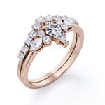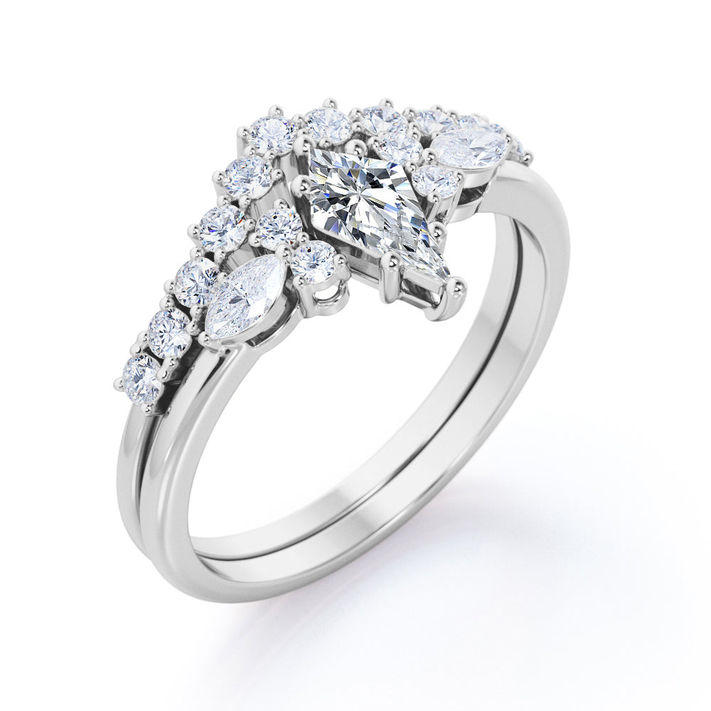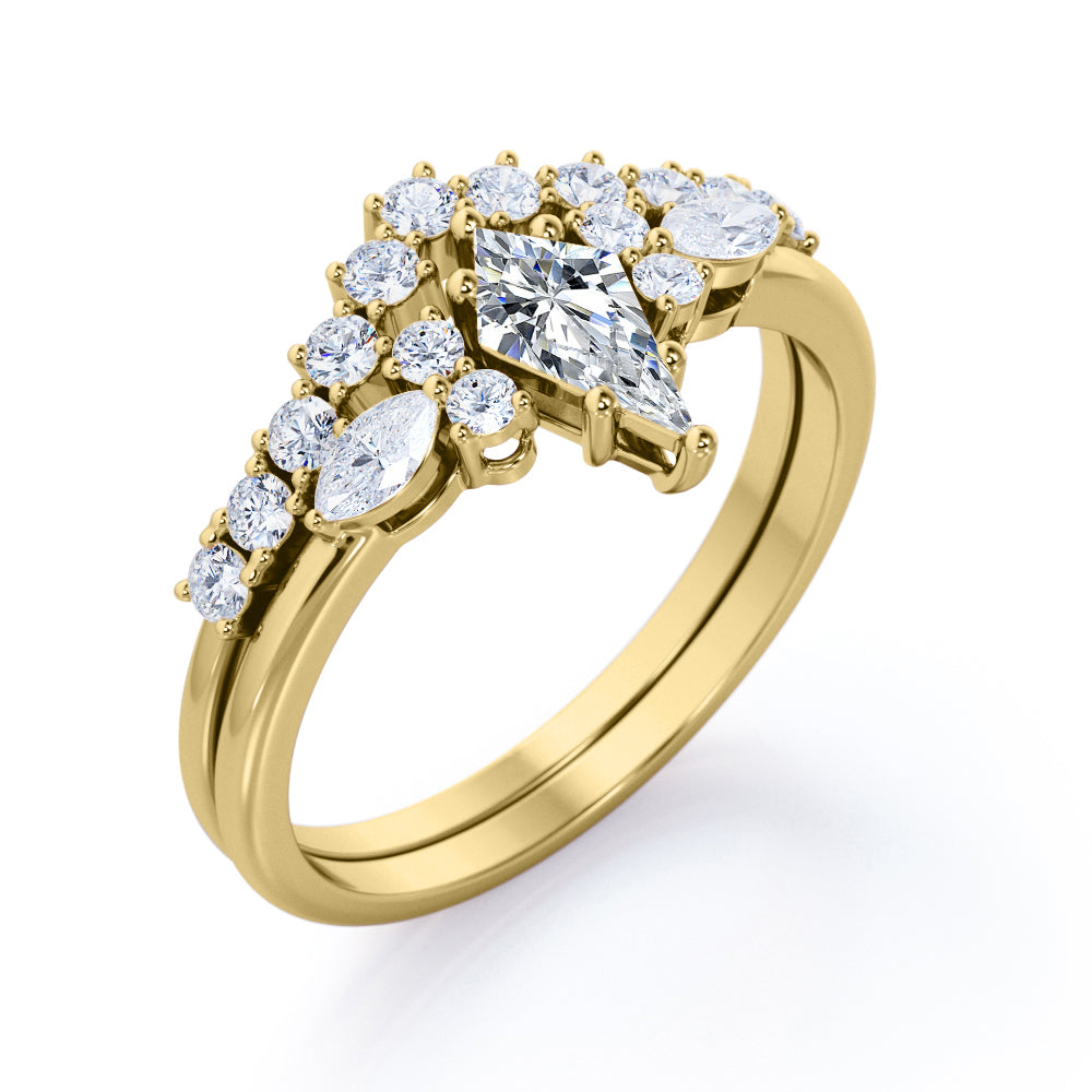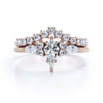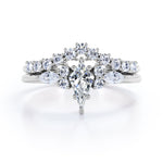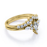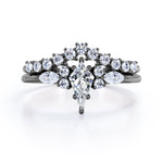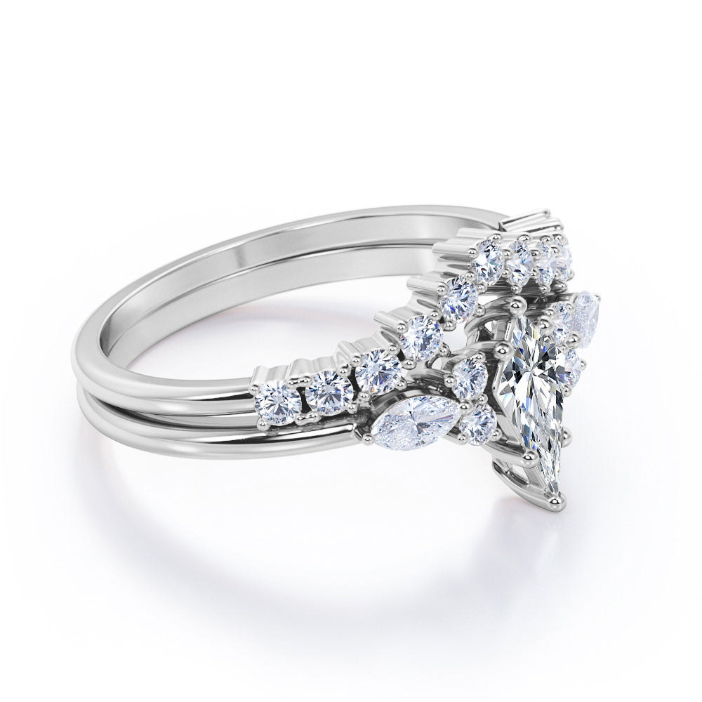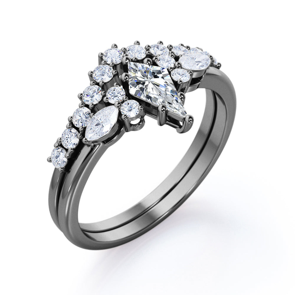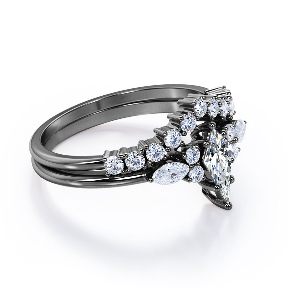 If you are seeking for a fine jewelry for your special day, you might want to consider our Sparkle 0.7 carat Kite Moissanite and Diamond Classic Bridal Set in Black Gold. The 7 stone ring set contains one engagement ring with the matching wedding band. The promise ring showcases a 0.5 carat kite with 4 round Moissanite and 2 marquise; seven stones are place next to each other with the kite chape at the center followed by round and marquise shape. Comes with the classy engagement ring is a chevron wedding band that possesses dainty round Moissanite by half of the band. Both rings give extra shines once they are worn together. They can be made in 18k gold over silver, 10k gold, 14k gold with the color of white gold, rose gold, yellow gold and black gold.