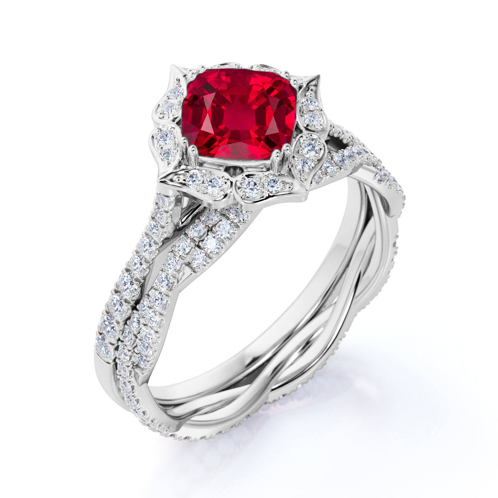 Sparkling Pave Halo 3 Carat Cushion Cut Ruby and Diamond Bridal Set with Infinity Band in White Gold