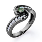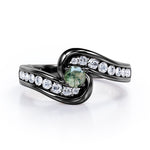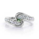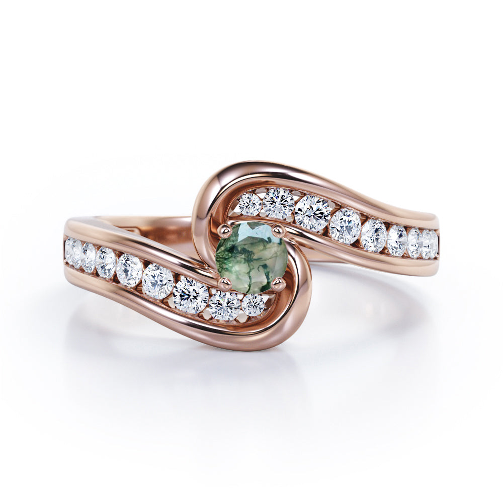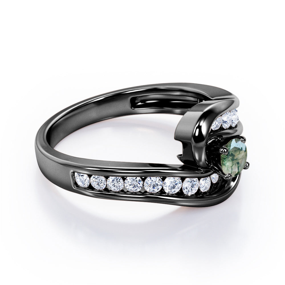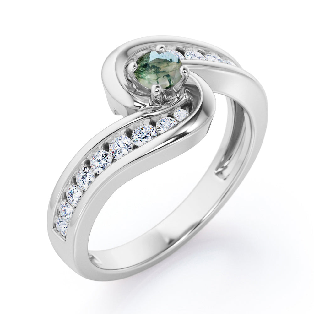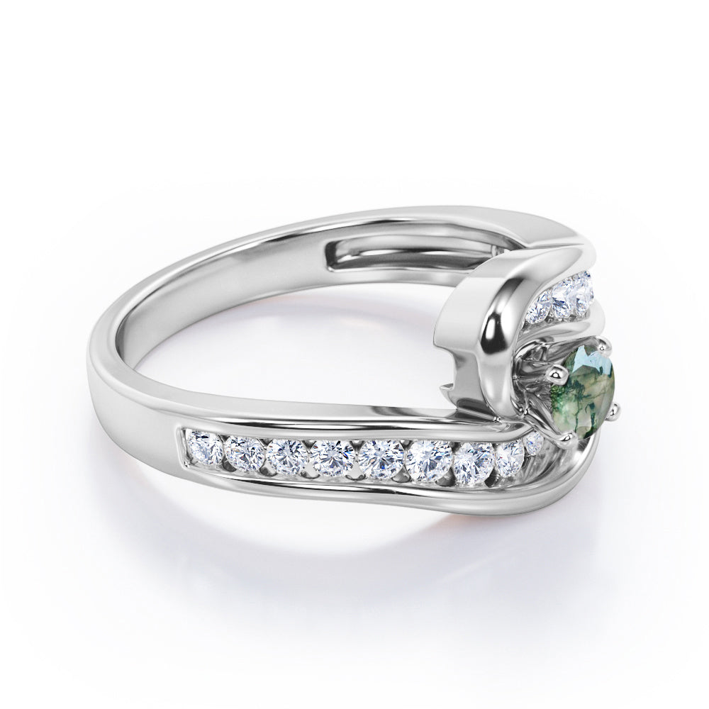 Take another step with your partner with a Spinning 0.7 carat Round Moissanite and diamond Channel Engagement Ring in White Gold. This promise ring features a 0.5 carat round Green Moss Agate in the center where the curved band are twisted and forged in to one. Half of the band displays dwindles round Moissanite in a channel setting for silver ring and diamond for gold ring. Green Moss Agate is believed to bring out your inner peacefulness, encouraging you to believe in yourself more. If you love to give a meaningful gift to your special someone, this ring is perfect for you. Moreover, this bypass ring comes at a very affordable price and it can be customized to your choice of white gold, rose gold, yellow gold and black gold with the metal of 18k gold over silver, 10k gold and 14k gold
