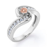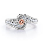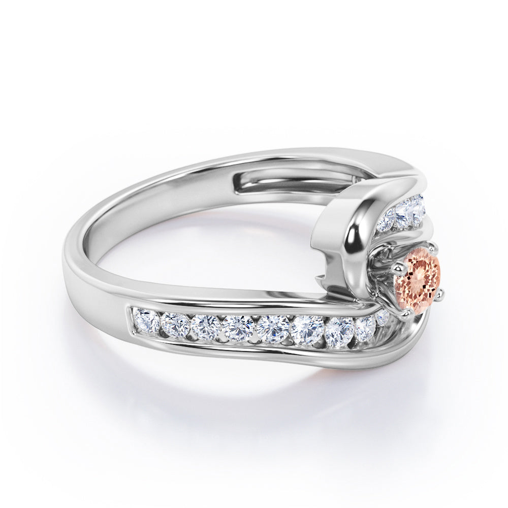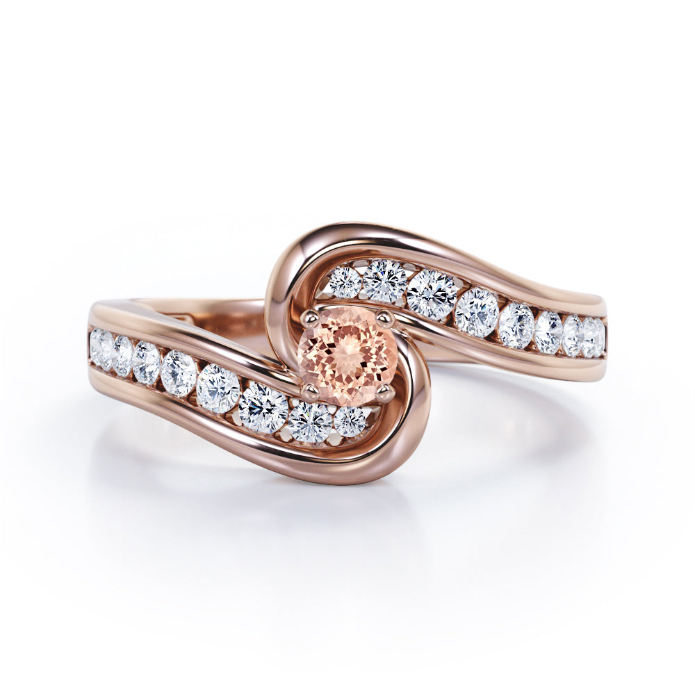 Take another step with your partner with a Spinning 0.7 carat Round Moissanite and diamond Channel Engagement Ring in Rose Gold. This promise ring features a 0.5 carat round Morganite in the center where the curved band are twisted and forged in to one. Half of the band displays dwindles round Moissanite in a channel setting for silver ring and diamond for gold ring. Morganite is believed to bring out your inner peacefulness, encouraging you to believe in yourself more. If you love to give a meaningful gift to your special someone, this ring is perfect for you. Moreover, this bypass ring comes at a very affordable price and it can be customized to your choice of white gold, rose gold, yellow gold and black gold with the metal of 18k gold over silver, 10k gold and 14k gold