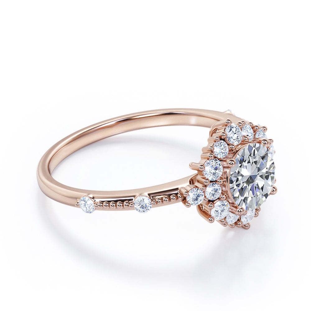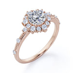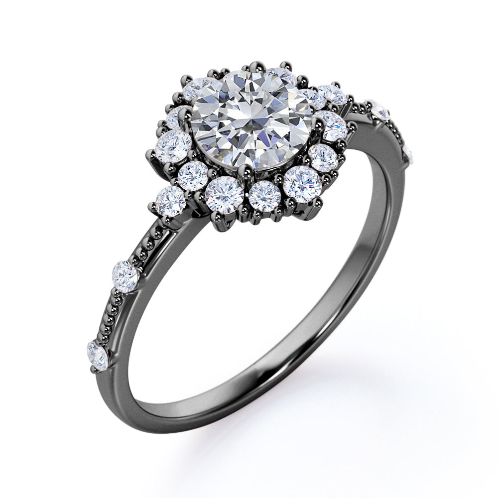 Let it snow even in summer. The Splendid Snowflake 0.6 carat Round Moissanite and Diamond Halo Engagement Ring in White Gold boasts a 0.5 carat round Moissanite amid of the round Moissanite halo. The band possesses a Milgrain decoration with dainty round Moissanite scatter around. The ring can be customized to your choice of 18k gold over silver, 10k gold or 14k gold with the color of white gold, rose gold, yellow gold and black gold.