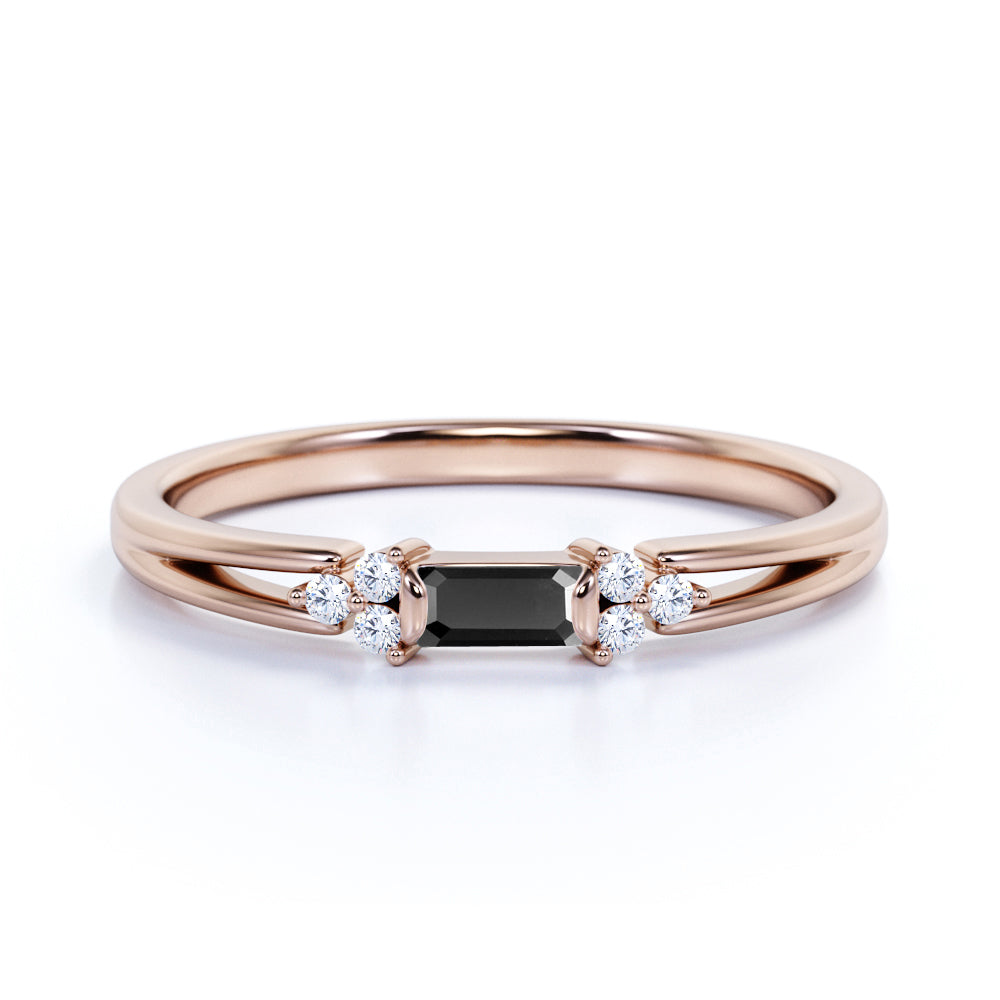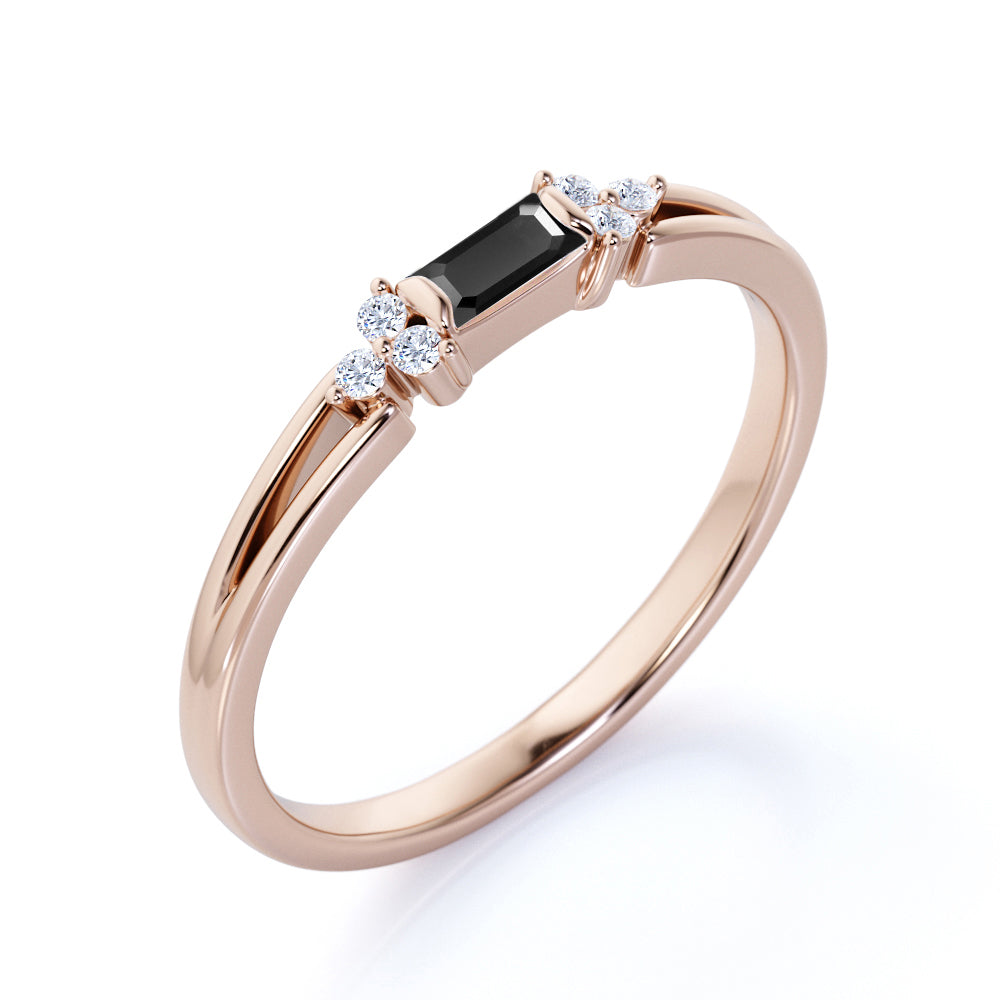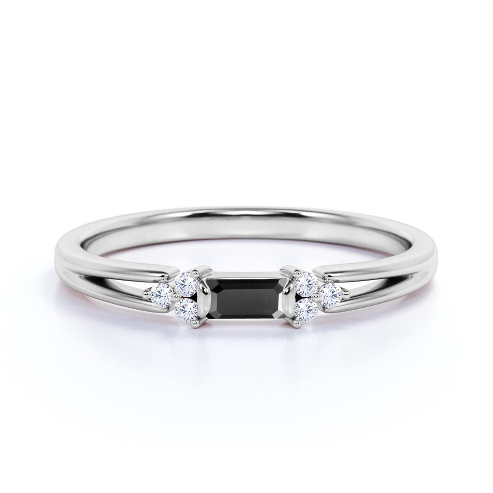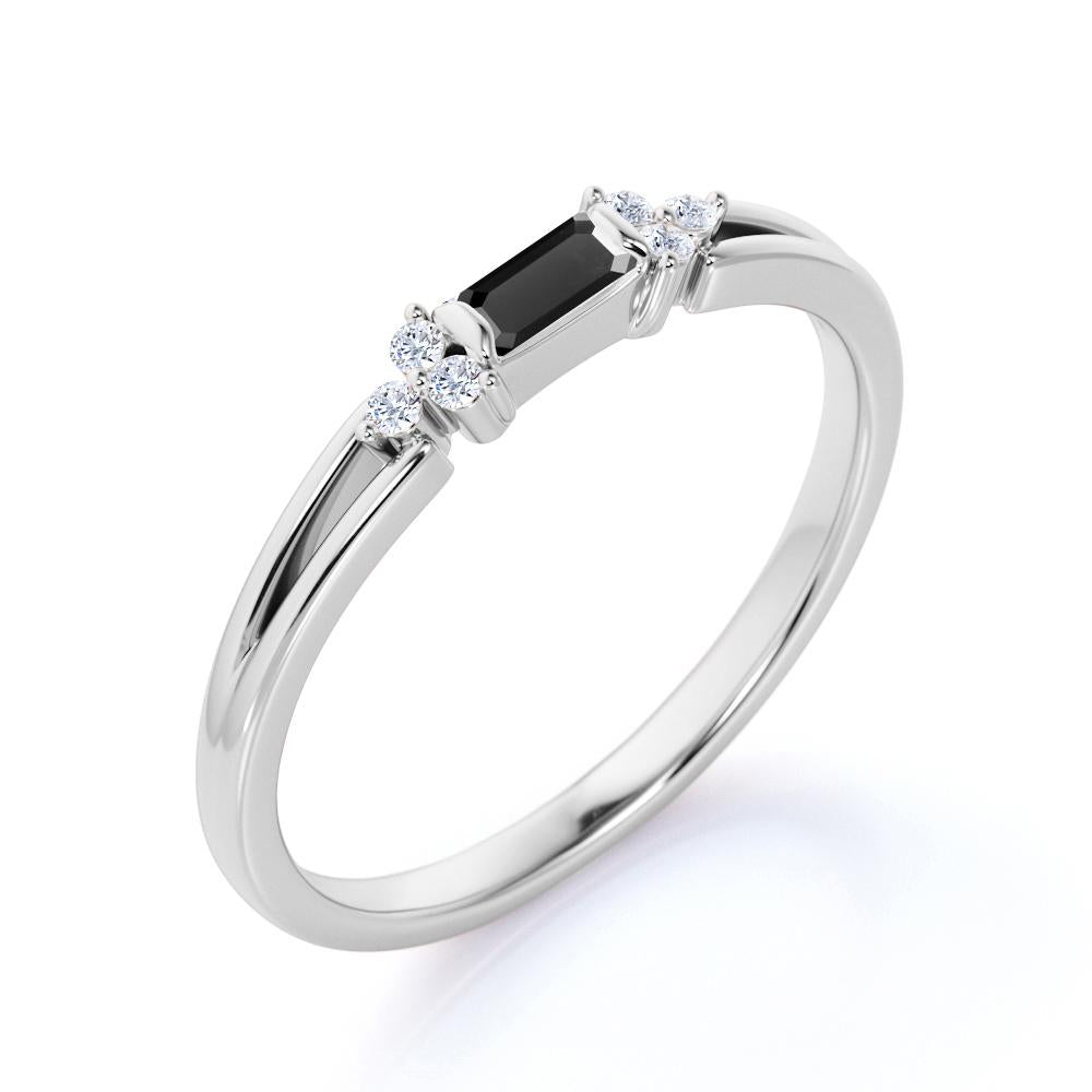 This black diamond engagement ring band is so durable and therefore, you can use it everyday and rely with this amazing black diamond daily wear engagement ring band. This ring can also be a bridesmaid gift, vow renewal ring or an elegant 60th birthday gift. This black diamond ring features an approximately .50 carat baguette shaped lab created black diamond, surrounded by .25 carat natural side diamonds, for a total weight of 0.75 carats.