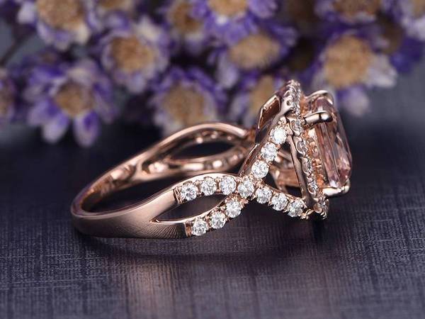 Split shank 1.50 Carat Cushion Cut Morganite and Diamond Engagement Ring in Rose Gold. Fascinating split shank peach pink morganite wedding ring set features total 1.50 carats perfect peach pink morganite with glittering diamonds and is made in solid 10k Rose Gold. Break away from the generic look of mass-produced jewelry with this intricate handmade piece.