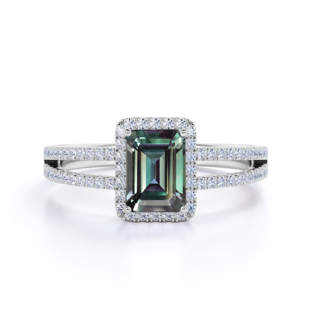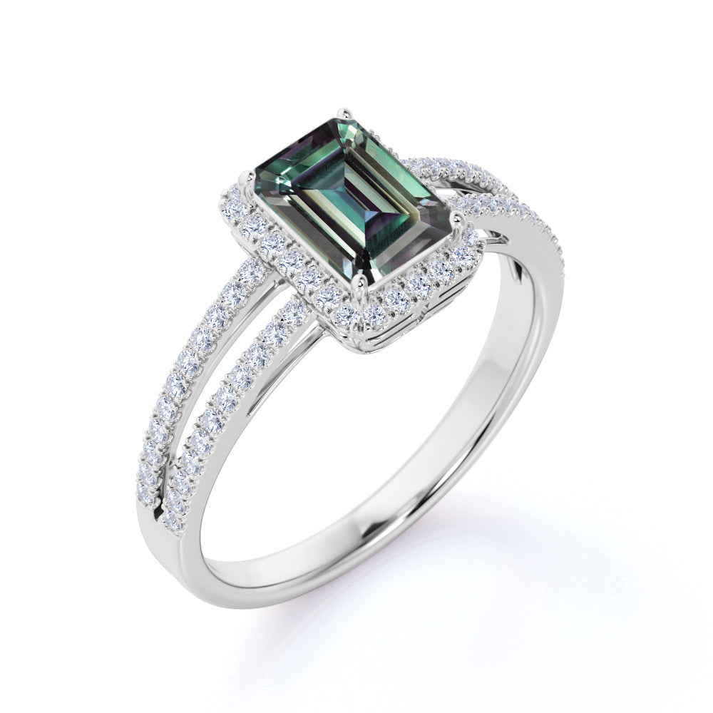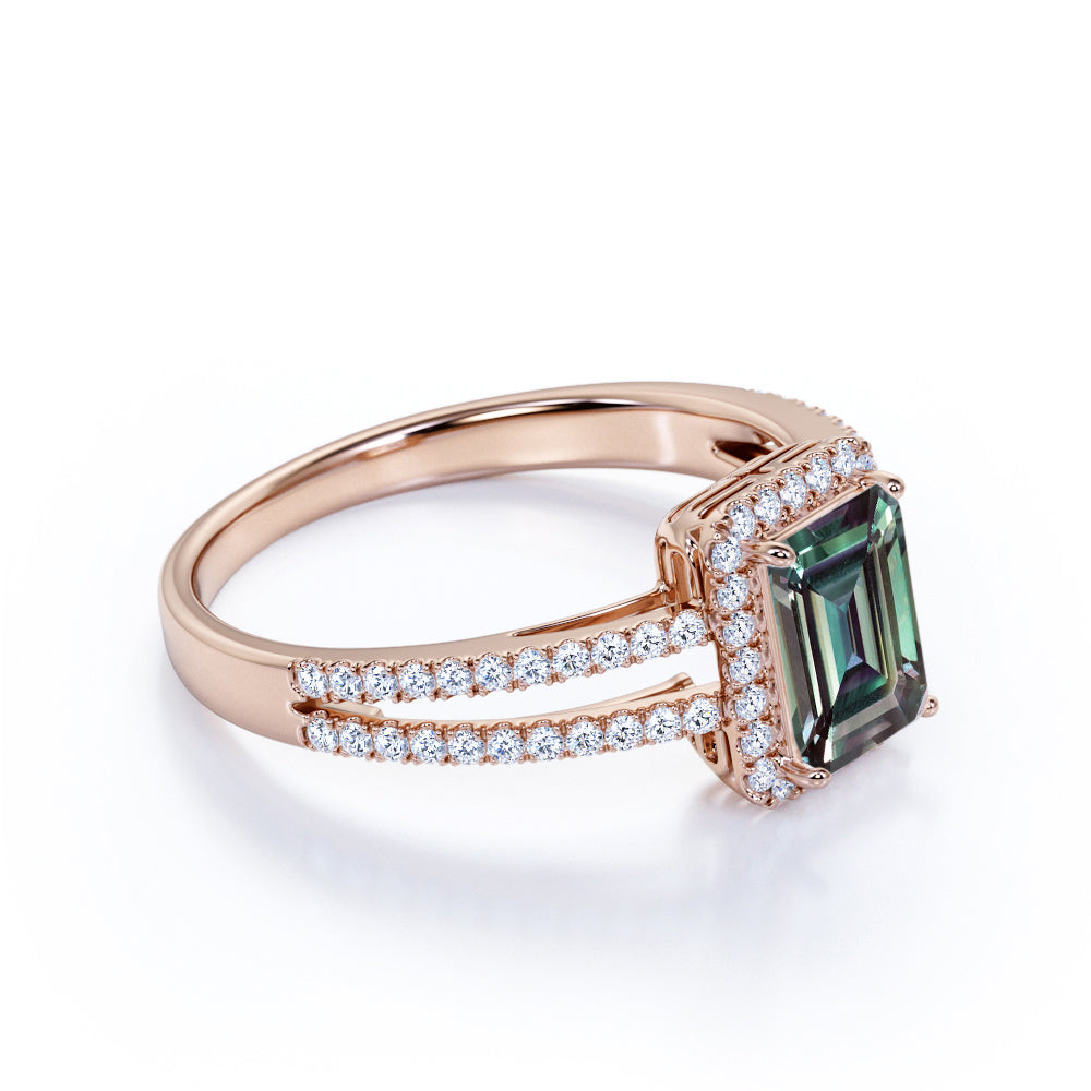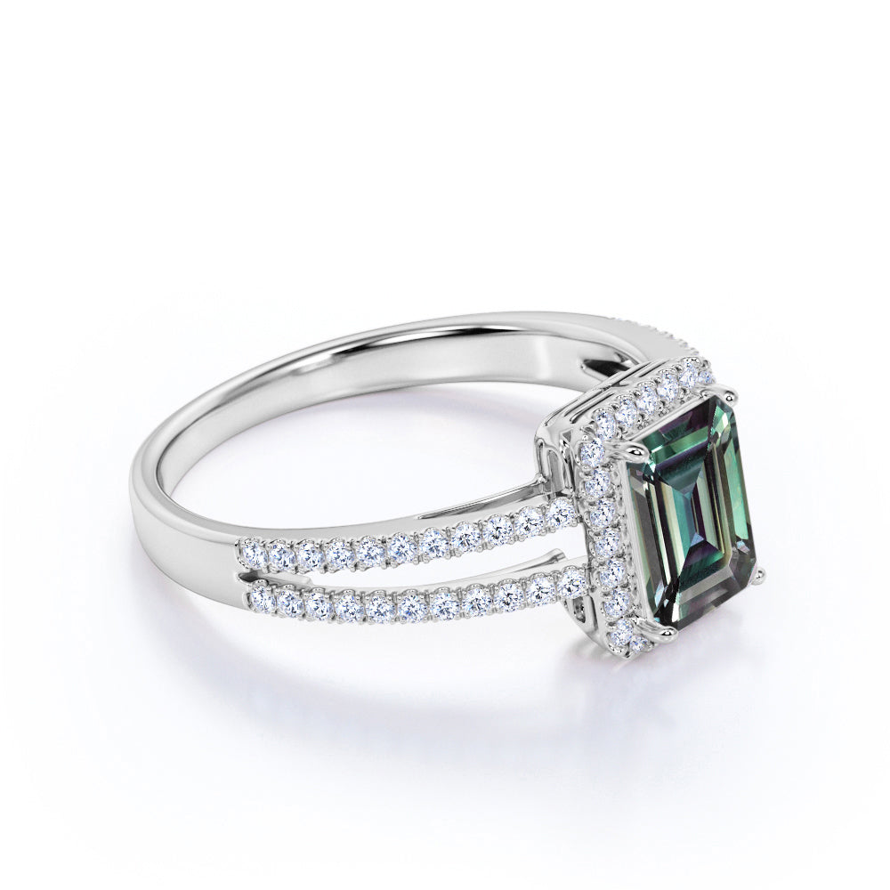 Split Shank 1.50 Carat Emerald Cut Man Made Alexandrite and Diamond Bezel Set Halo Engagement Ring