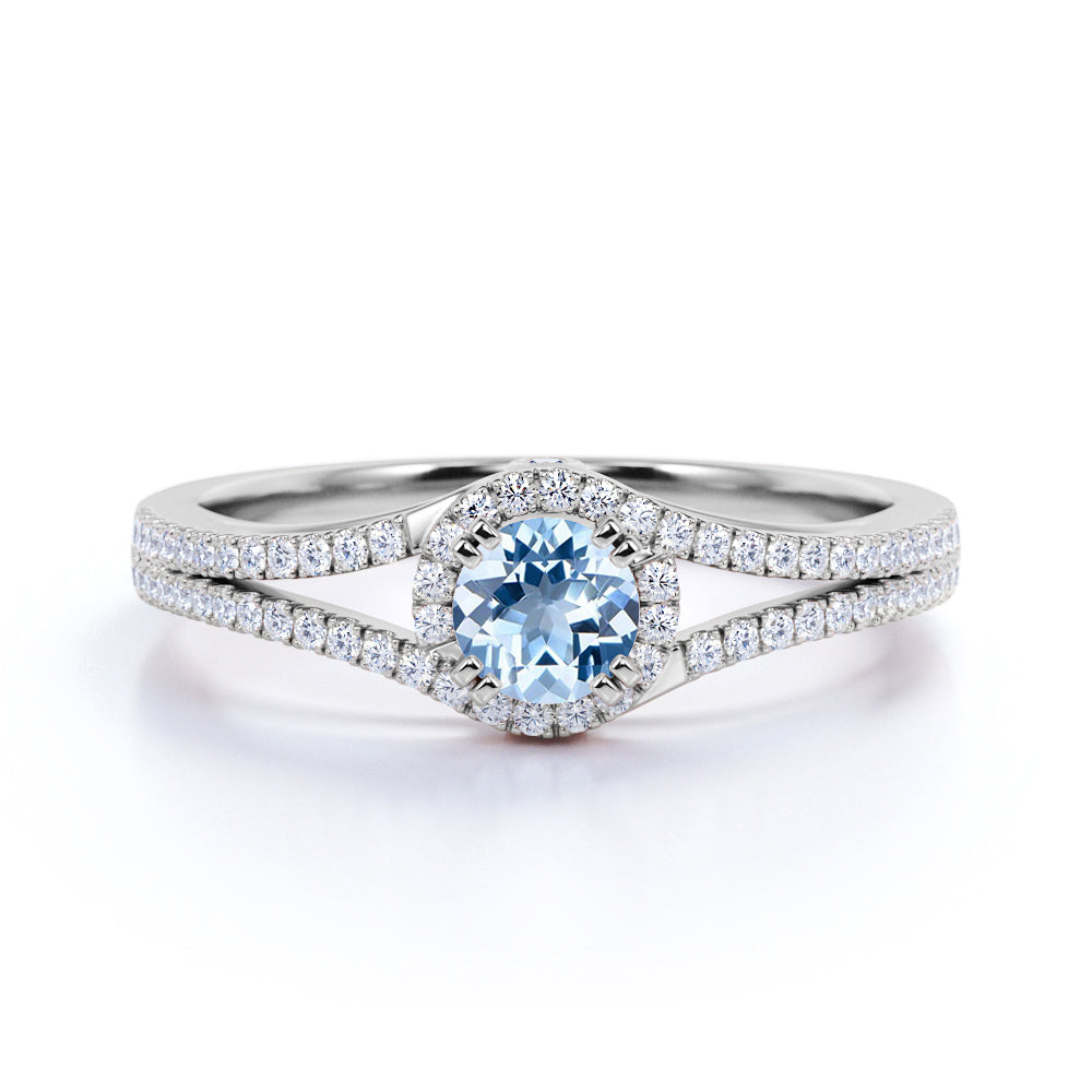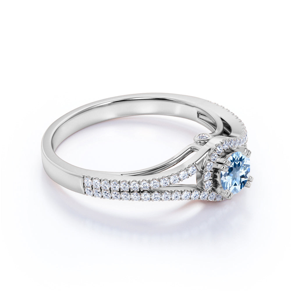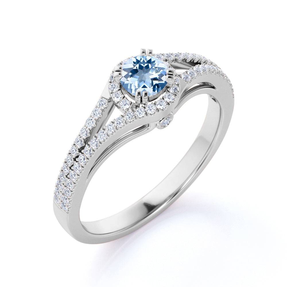 Split Shank 1.50 Carat Round Dark Blue Aquamarine and Diamond Fishtail Engagement Ring in White Gold