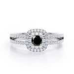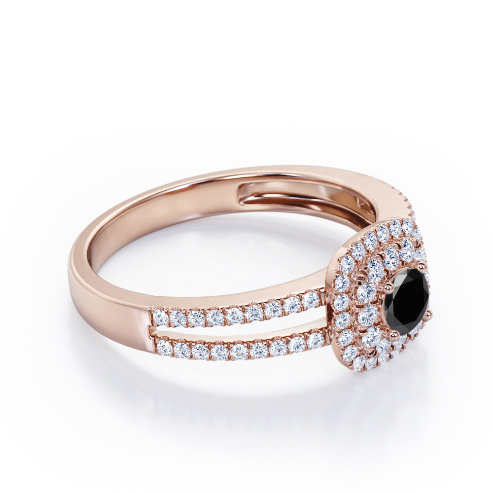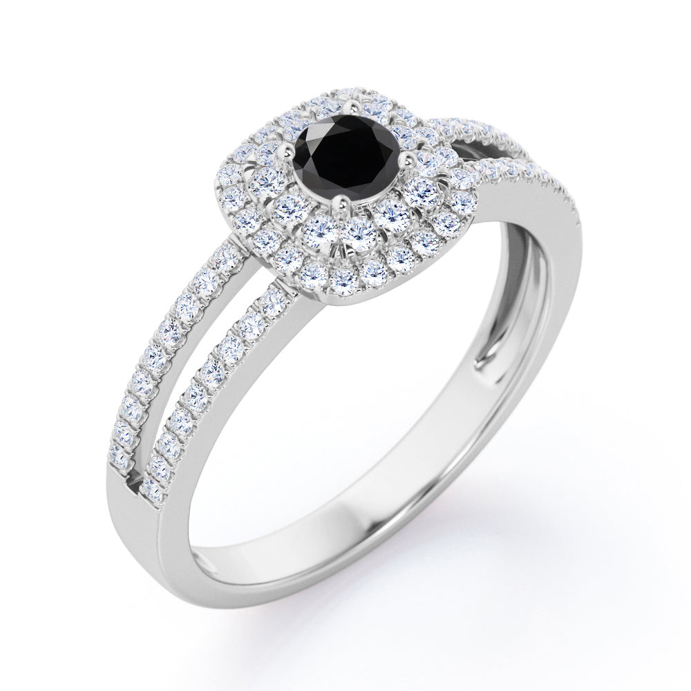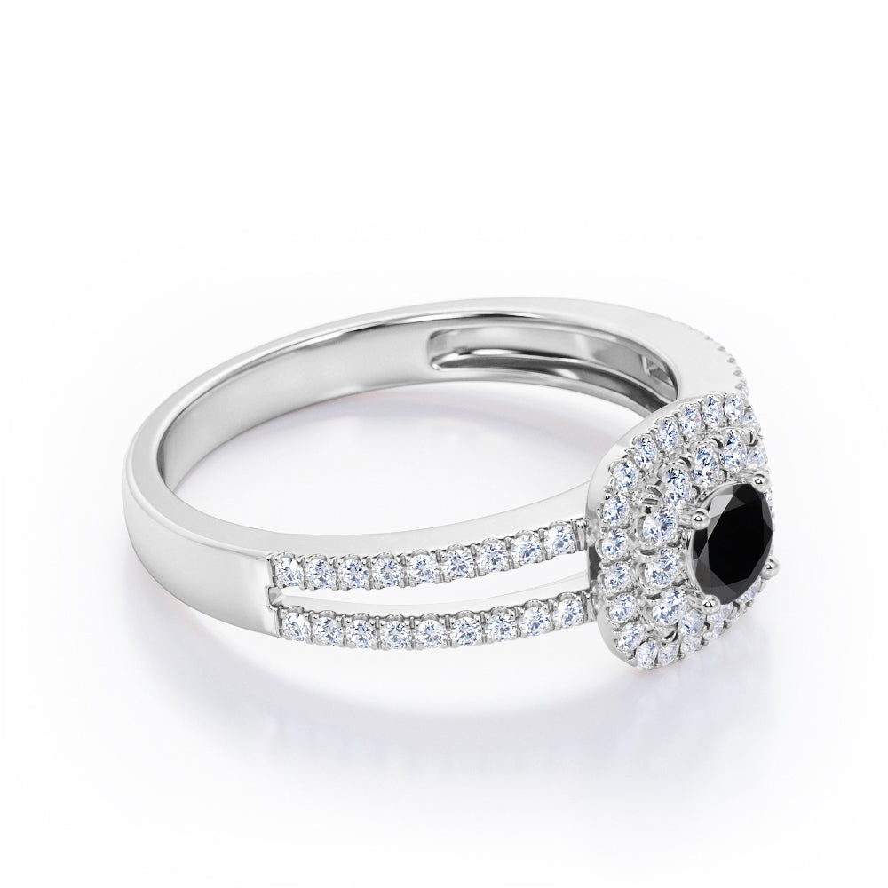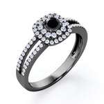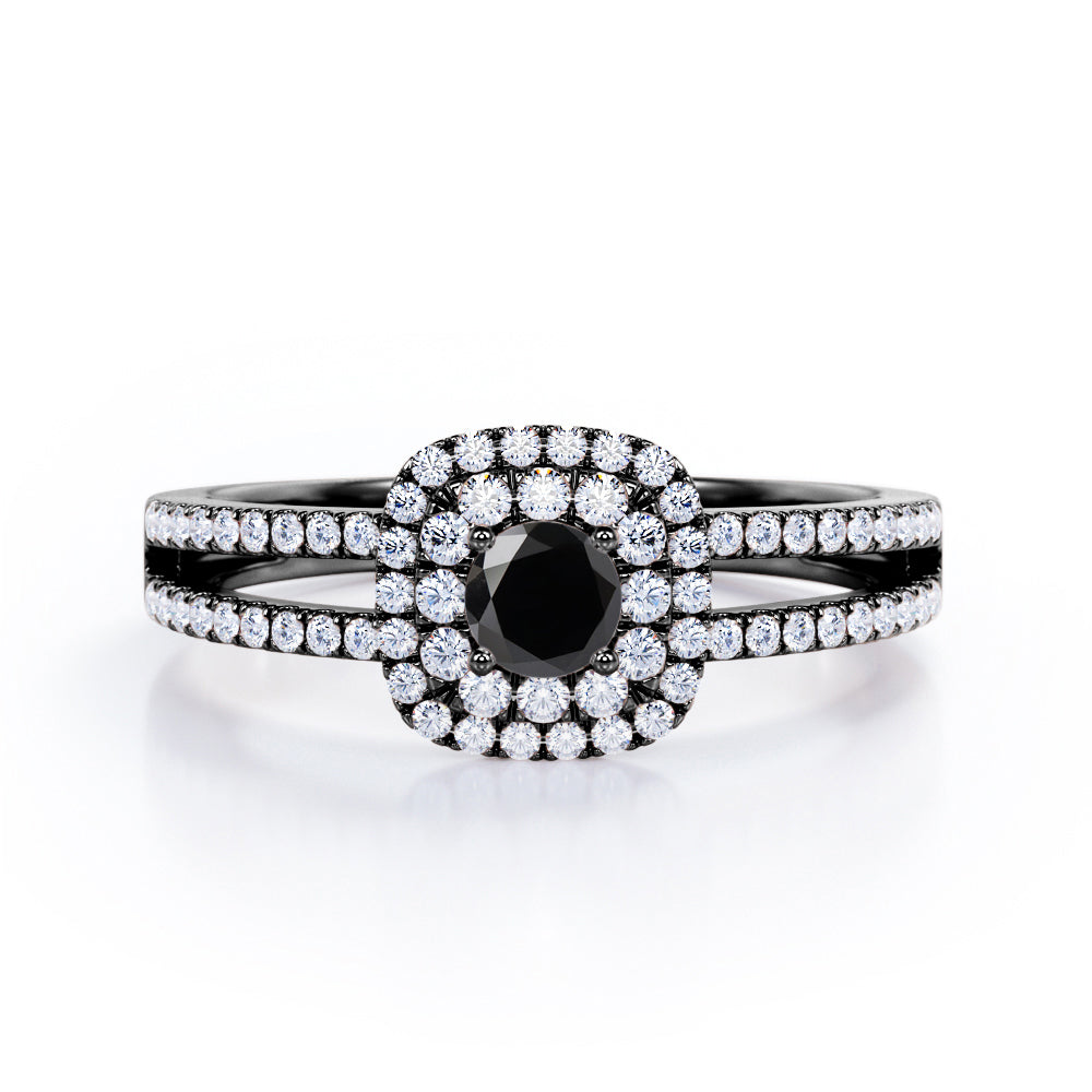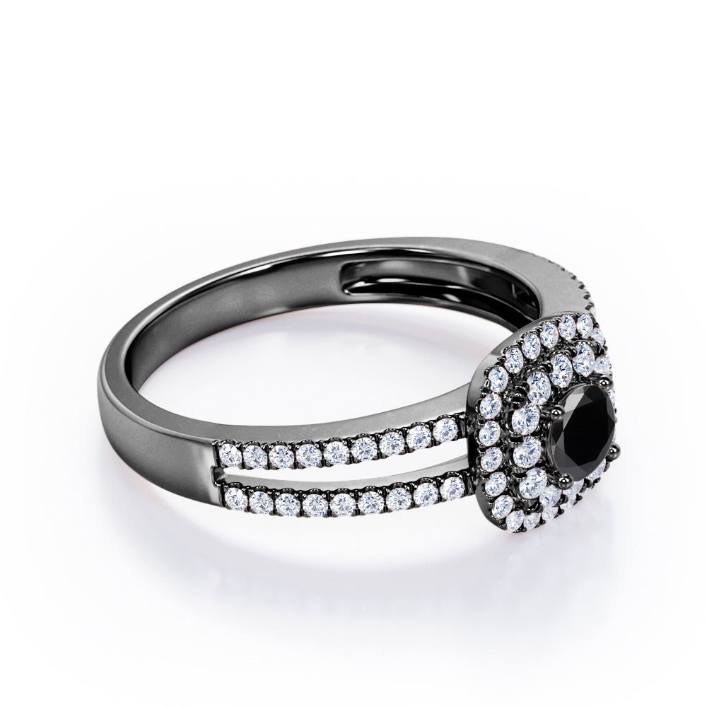 Split Shank 1.55 Carat Round Cut Black Diamond Double Halo Engagement Ring In Black Gold. Promise to love her for a lifetime when you present her with this alluring Black Diamond engagement ring. Between the striking halo design and brilliant center, this contemporary engagement ring exudes elegance and sophistication. The black gold band is encompassed by even more diamonds for a standout finish. A brilliant round cut center black diamond is surrounded by smaller white diamonds in an expansive double halo. The split shank style adds a bit of drama and unique style to create a charismatic look on your fingers. The shimmering diamonds are pave set which exhibits strong brilliance and undeniable sparkle. Handmade by our well-experienced artisans, this split shank 1.55 carat round cut black diamond double halo engagement ring can also be customized to 10k Gold or 14k Gold as per your preference.