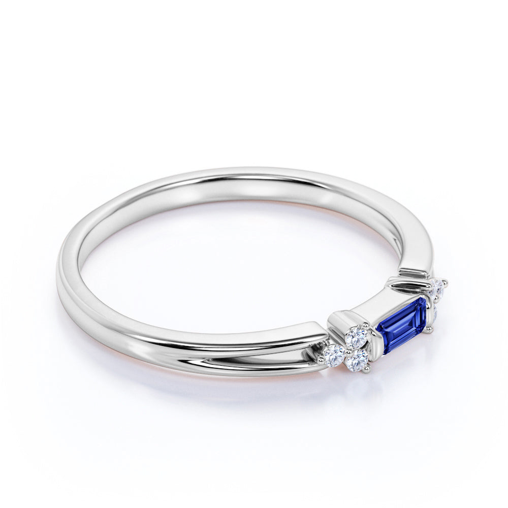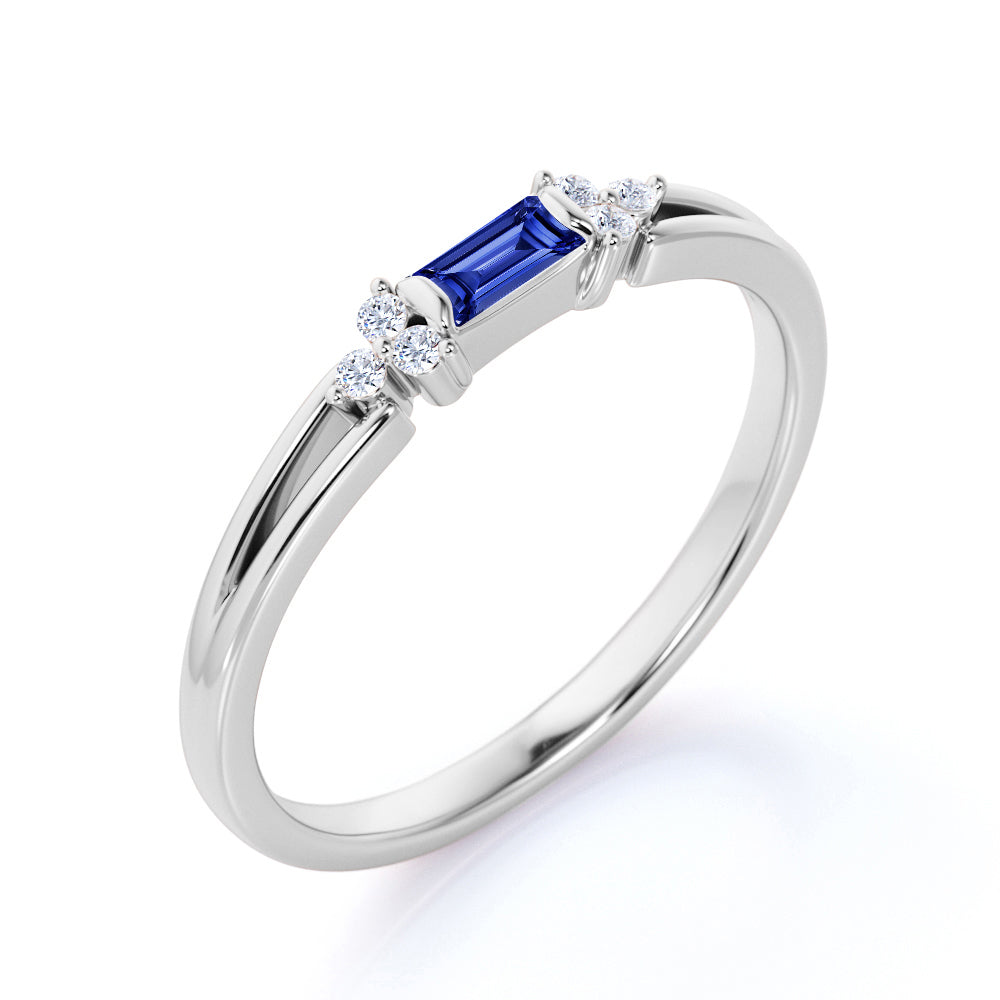 Split Shank 1 Carat Baguette Purplish Blue Sapphire and 7 Stone Diamond Engagement Ring in White Gold