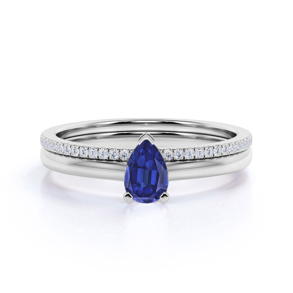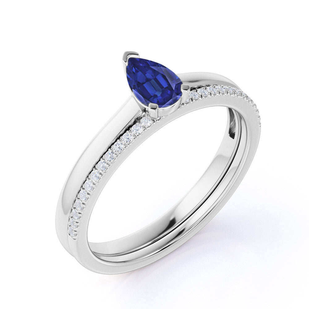 Classic Prong Solitaire 2 Carat Pear Cut Sapphire and Diamond Pave Wedding Ring Set in White Gold