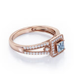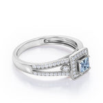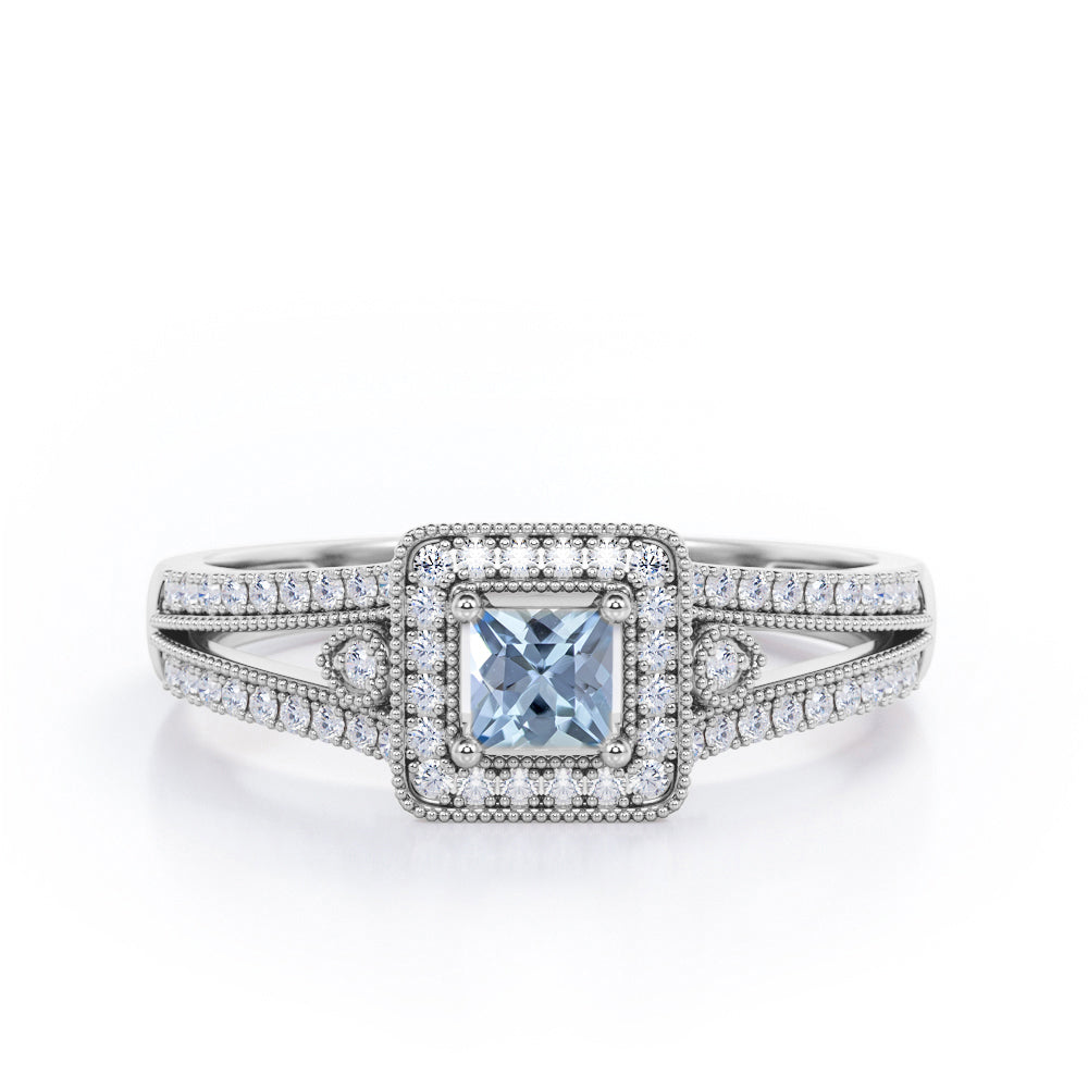 With this Split-Shanked Pave 1.55 Carat Princess Cut Aquamarine Milgrain-Bordered Halo Engagement Ring in White Gold, your significant other will be on cloud nine all the time. Hand-cut with deftness into a lovely shape princess cut by our lapidary expertise, this beautiful affordable Aquamarine engagement ring showcases a a 1 carat Princess cut Aquamarine gemstone in the center with sparkling diamonds on the side as the side stones. Distinct and unusual, this Aquamarine statement ring is an excellent choice. Known for its healing properties, this gem engagement ring is magnificent with its glory and brilliance and will be an unmistakable addition to any jewelry collection. This Aquamarine engagement ring is stunning and inexpensive, thanks to its reasonable price. This Aquamarine ring, the birthstone ring for April, symbolically represents love and dedication, is the best gift you can give to your significant other. Also, this Aquamarine statement ring can be customized, either in white gold, rose gold, yellow gold, black gold, upon customer request. Your love story will be complete with this Aquamarine anniversary ring.