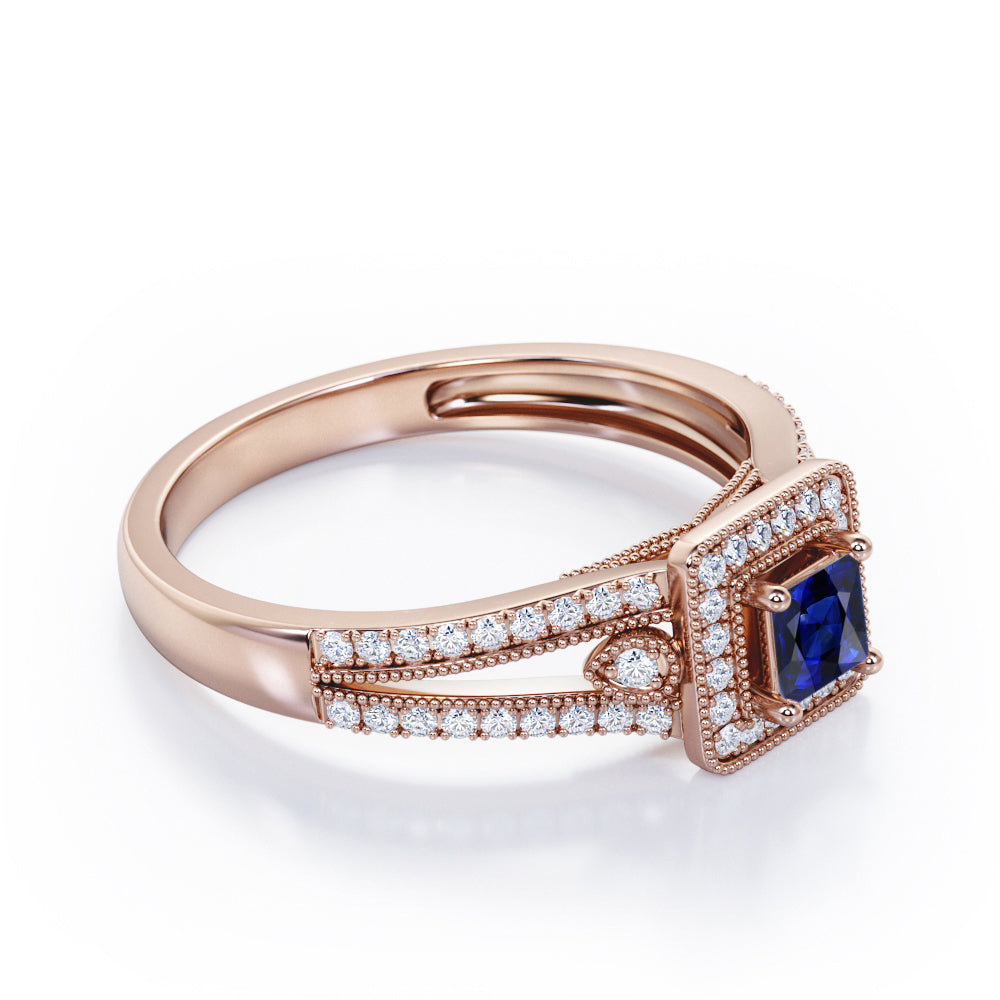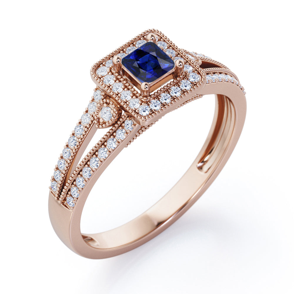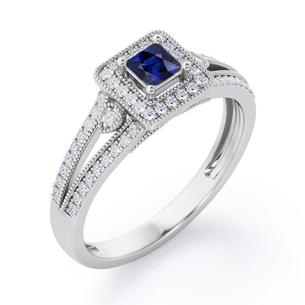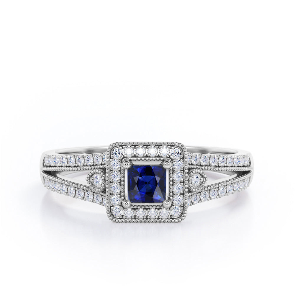With this Split-Shanked Pave 1.55 Carat Princess Cut Blue Sapphire and diamond Milgrain-Bordered Halo Engagement Ring in White Gold, your significant other will be on cloud nine all the time. Hand-cut with deftness into a lovely shape princess cut by our lapidary expertise, this beautiful affordable Blue Sapphire engagement ring showcases a a 1 carat Princess cut Blue Sapphire gemstone in the center with sparkling diamonds on the side as the side stones. Distinct and unusual, this Blue Sapphire statement ring is an excellent choice. Known for its healing properties, this gem engagement ring is magnificent with its glory and brilliance and will be an unmistakable addition to any jewelry collection. This Blue Sapphire engagement ring is stunning and inexpensive, thanks to its reasonable price. This Blue Sapphire ring, the birthstone ring for September, symbolically represents love and dedication, is the best gift you can give to your significant other. Also, this Blue Sapphire statement ring can be customized, either in white gold, rose gold, yellow gold, black gold, upon customer request. Your love story will be complete with this Blue Sapphire anniversary ring.