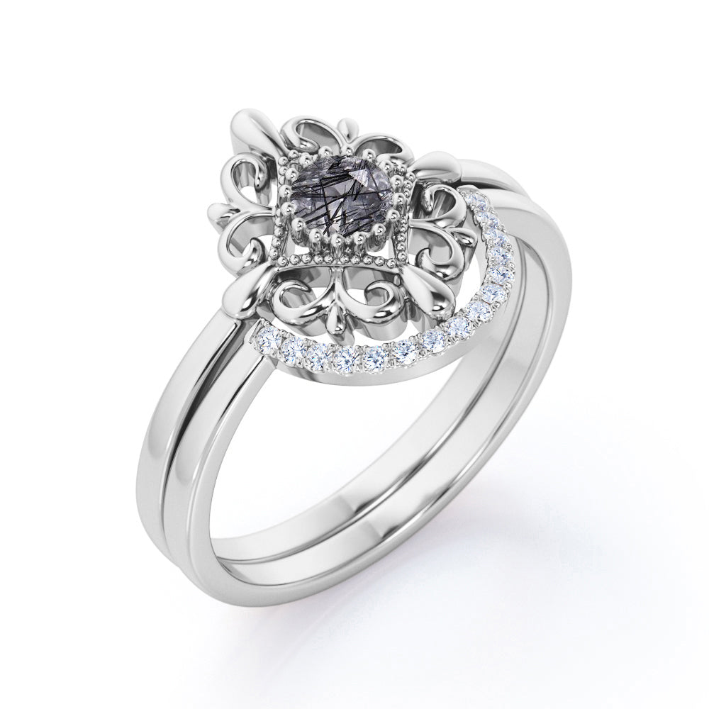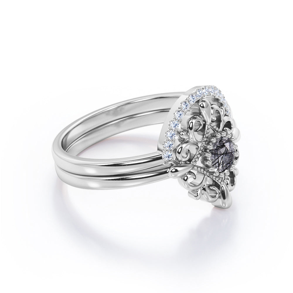 Starburst Filigree 0.65 Carat Round Cut Druzy Black Rutilated Quartz and Diamond Curved Pave Wedding Set Rings