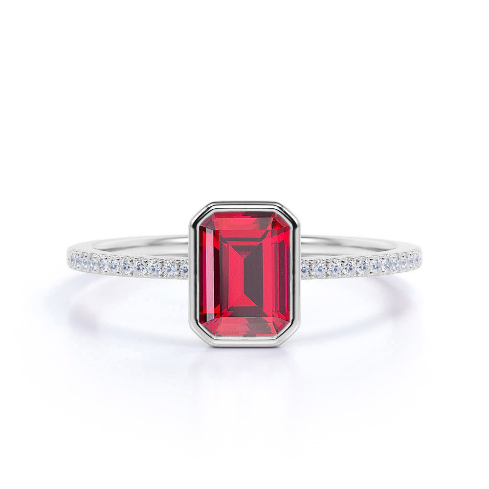 A classic bezel set 1.25 Carat Emerald Cut Lab Ruby and Micro Pave Diamond Engagement Ring in White Gold for women. Handmade and customized to perfection, this plain shank engagement ring is made with Lab Ruby, diamonds and gold. As always, the order comes with jewelry certificate, 6 month limited warranty and 30 days full refund policy. Although each ring is handmade and customized to your specifications, we guarantee that once you placed your order, we will make and deliver it to you within 5 business days.