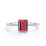 A classic bezel set 1.25 Carat Emerald Cut Ruby and Micro Pave Diamond Engagement Ring in White Gold for women. Handmade and customized to perfection, this plain shank engagement ring is made with natural ruby, real diamonds and real gold. As always, the order comes with jewelry certificate, 6 month limited warranty and 30 days full refund policy. Although each ring is handmade and customized to your specifications, we guarantee that once you placed your order, we will make and deliver it to you within 5 business days.