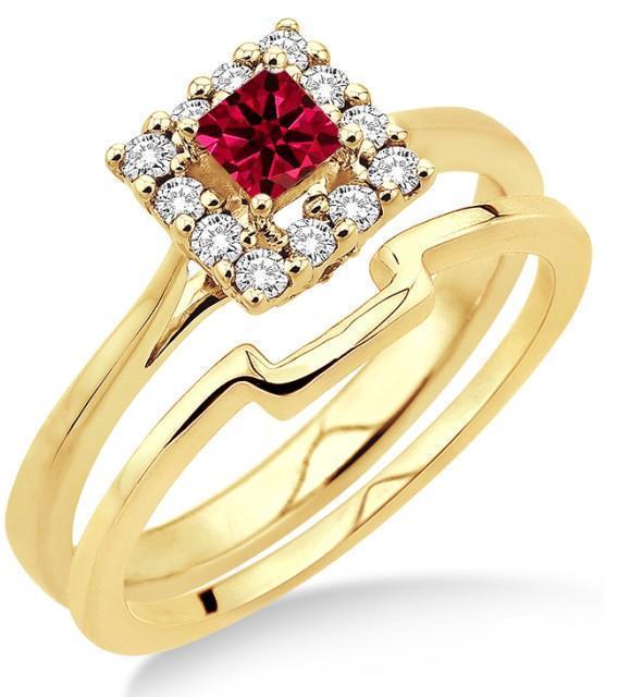 Stunning 1.25 Carat Princess Real Ruby and Moissanite Bridal Wedding Ring Set with Engagement Ring and Wedding Band in 18k Gold Over Silver