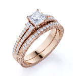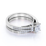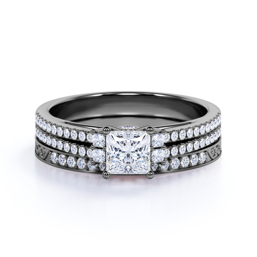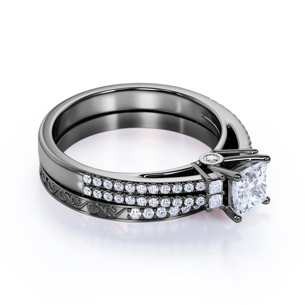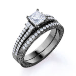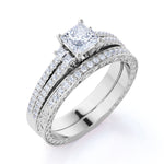 Stunning 1.25 ct - Princess Cut Moissanite - Pave - Vintage - Double Band Engagement Ring - Bridal Set - 18K White Gold over Silver
