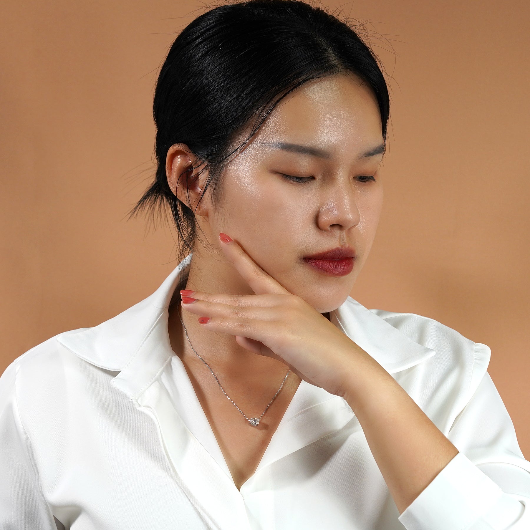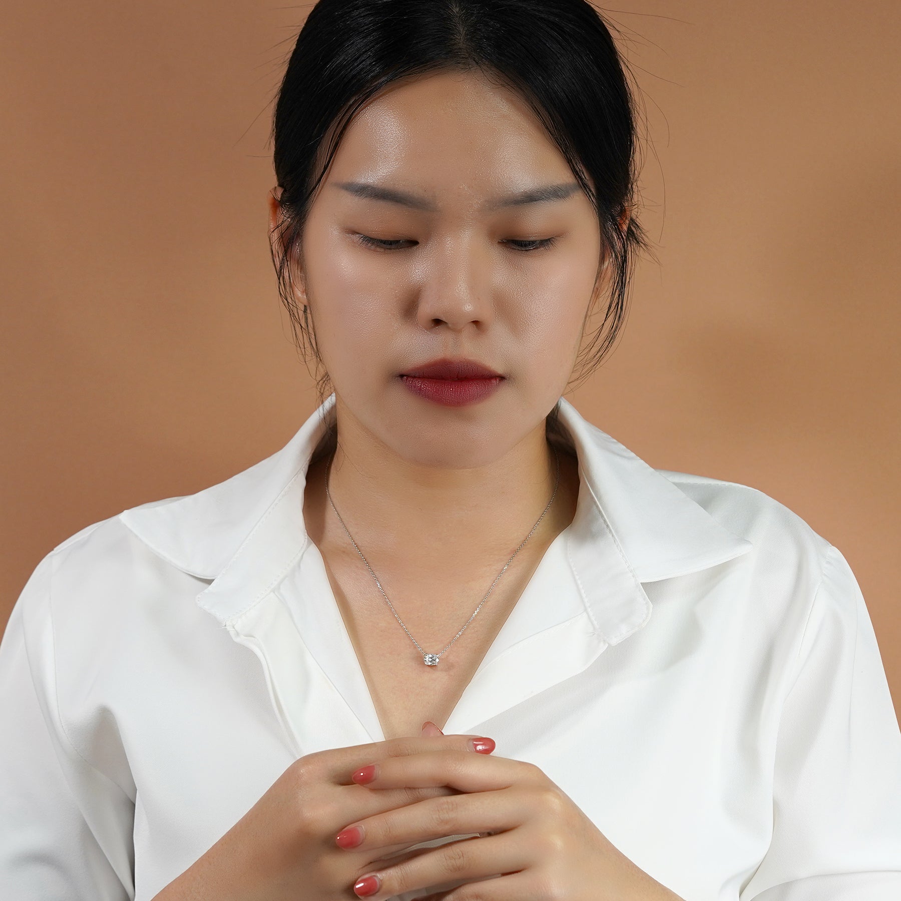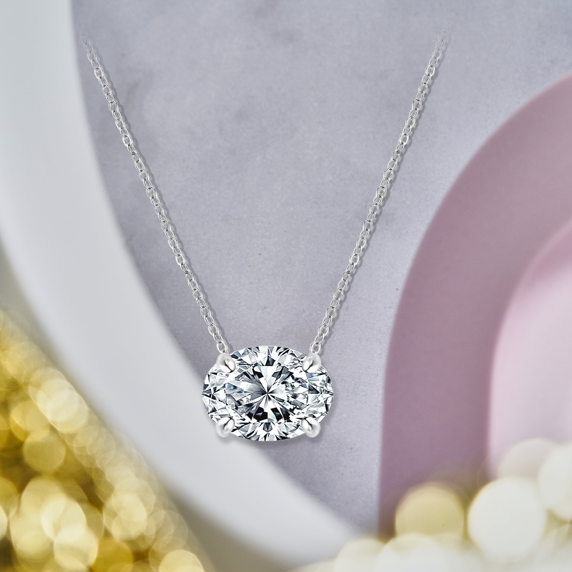 Excitingly introducing our Stunning 1 TCW East West Oval Cut Moissanite - Four Prongs - Solitaire Slider Pendant Necklace in 18K White Gold over Silver. This meticulously crafted oval moissanite necklace combines high-quality craftsmanship with affordability, making this oval solitaire pendant the perfect addition to your dainty jewelry collection. Our solitaire pendant necklace features a brilliant 1 carat East West oval moissanite, skillfully set in a four-prong setting to ensure maximum sparkle and security. The moissanite's fiery brilliance is further enhanced by its unique horizontal orientation, creating a captivating east-west oval pendant design that sets it apart from traditional vertical styles. The oval pendant setting hangs and glides along its chain made from lustrous 18K white gold over silver. This slider necklace silver not only offers a comfortable fit but also allows you to customize the length to perfectly complement any neckline or outfit.