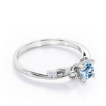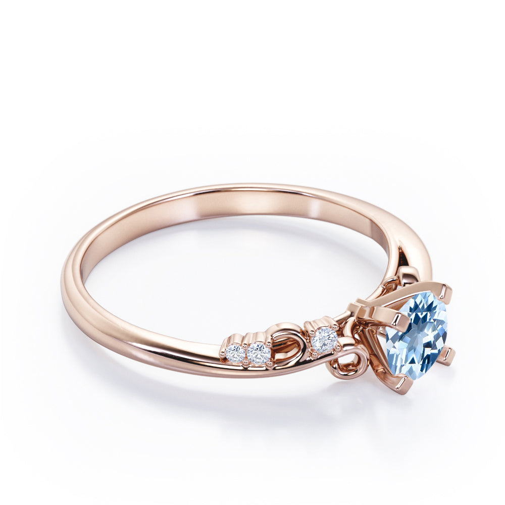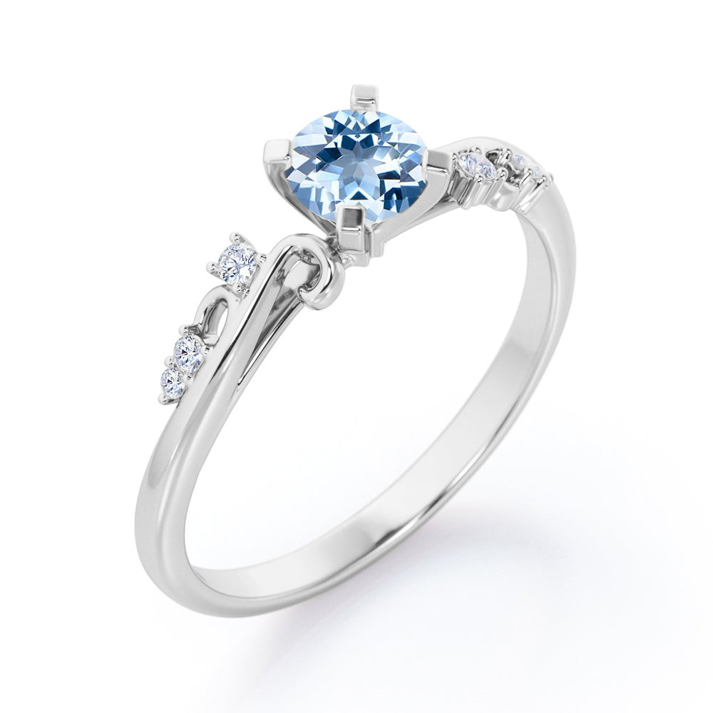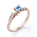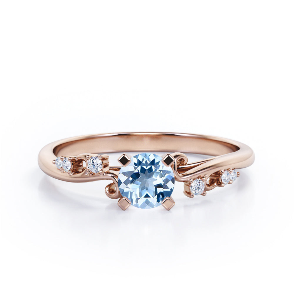 Stylish 1.05 Carat Round Cut Aquamarine And Diamond Seven Stone Engagement Ring In Rose Gold. Effortless and elegant, this is a piece you're bound to love forever. A captivating round shaped Aquamarine of 1 carat is accompanied by six dainty round shaped 0.05 carat diamonds on either side in a plain rose gold band. This round shaped aquamarine held in a classic four prong setting radiates simple elegance. The swirling design on the band is something very unique which adds more value to this aquamarine and diamond engagement ring. This seven stone ring can also be an ideal seven years anniversary gift for your loved ones. This stylish 1.05 carat round cut aquamarine and diamond seven stone engagement ring in rose gold can also be customized to 18k Gold plating over silver, 10k Gold or 14k Gold as per your preference. So, wait no more, just make this statement piece the symbol of your love by clicking the add to cart button below. Please note that if the ring is made over silver, the side stone will be moissanite and if it is made on gold, diamond will be employed as the side stone.