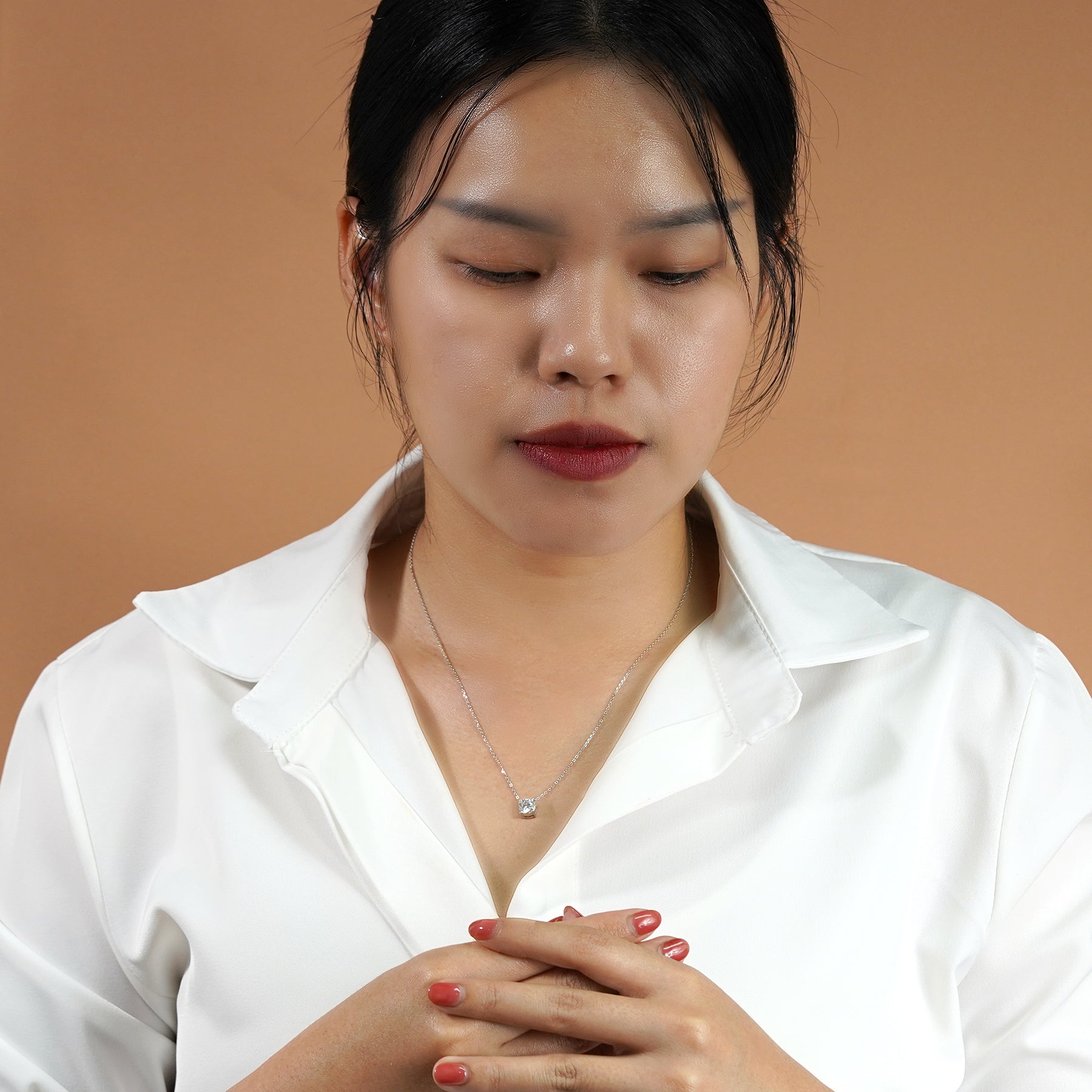Fulfill her desires with our Stylish 1 Carat Cushion Cut Moissanite Solitaire Slider Pendant Necklace- Prongs Setting - in 18K White Gold over Silver. This stunning female pendant necklace combines timeless elegance with affordability, making this cushion cut pendant necklace the perfect accessory for any woman seeking both quality and style. Our silver slide necklace is a true masterpiece, featuring a brilliant 1 carat cushion cut moissanite gemstone that sparkles with unparalleled radiance. The cushion pendant also glides freely along the chain showcasing a unique trait of a slider chain. The solitaire pendant necklace also allowing you to adjust the length with ease, ensuring a comfortable fit for any occasion. This piece is perfect for those looking for good quality and affordable pendant necklace for woman.
