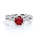 Stylish Infinity Halo Design 1.25 Carat Round Cut Lab Ruby and Diamond Wedding Ring Set in White Gold