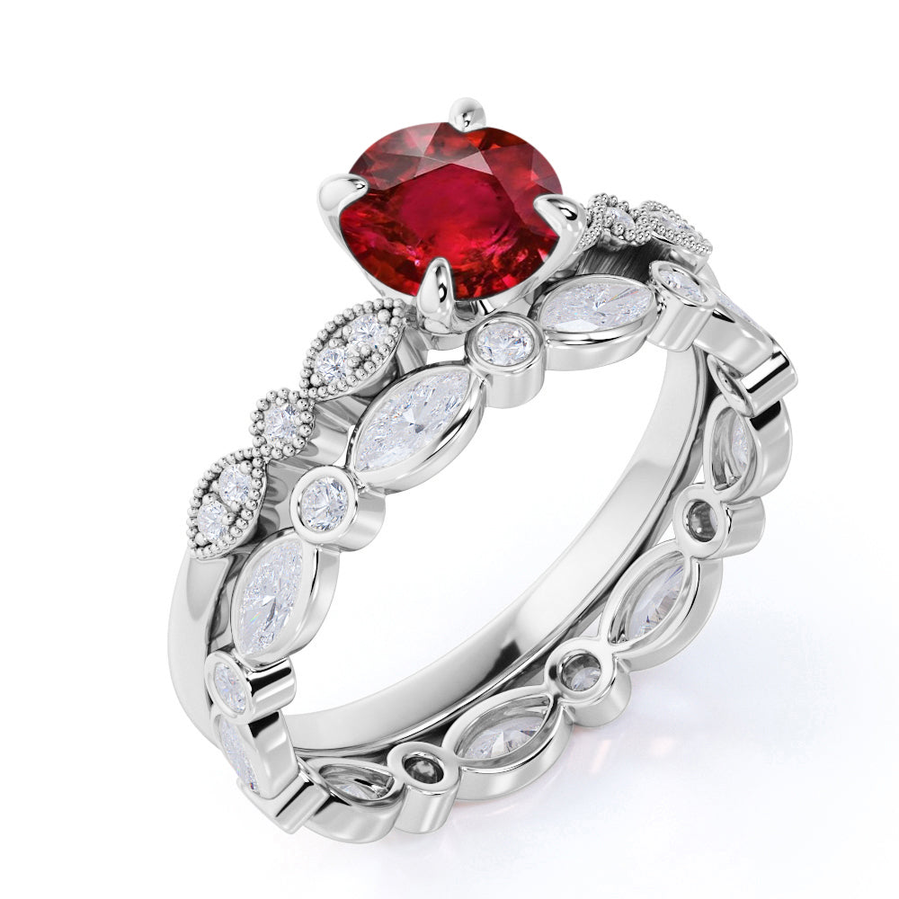 Antique Stylish Four Prong Set 2.50 Carat Round Cut Lab Ruby and Diamond Eternity Wedding Set in White Gold