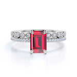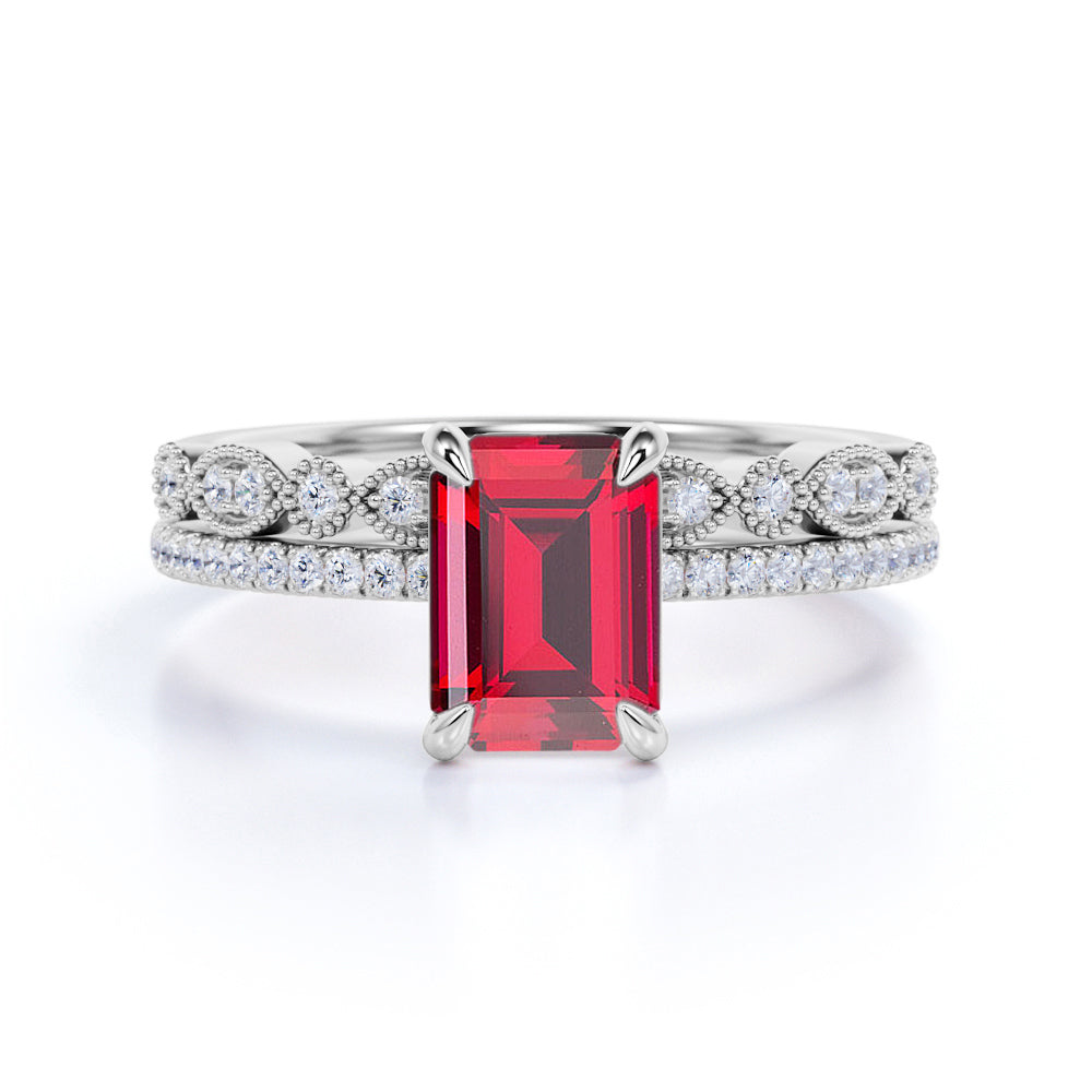 Vintage 1.45 ct Emerald Lab-Created Ruby Pave Wedding Set