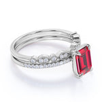 This is a 1.45 Carat Emerald Cut Lab-Created Ruby and Pave Art Deco Diamond Wedding Set in White Gold. The milgrain four prong set design weddings set features 1 carat princess cut Lab-Created Ruby in the center, surrounded with 0.45 carat of diamonds, for a total carat weight of 1.45 Carats. The Ruby wedding set can be made in either Rose, White or Yellow Gold, and can be customized to your choice of 10k, 14k or 18k Gold over Silver. As always, the order comes with jewelry certificate, 6 month limited warranty and 30 days full refund policy. We also guarantee that once you placed your order, we will make and deliver it to you within 2 weeks.