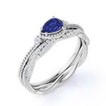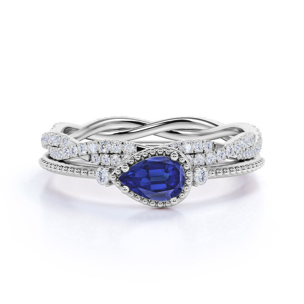 This is a classic three stone milgrain bezel set 2 Carat Pear Cut Sapphire and Diamond Wedding Set with Infinity Band in White Gold. The bezel set design weddings set features 1.25 carat pear cut Sapphire in the center, surrounded with 0.75 carat of diamonds, for a total carat weight of 2 Carats. The sapphire wedding set can be made in either Rose, White or Yellow Gold, and can be customized to your choice of 10k, 14k or 18k Gold. As always, the order comes with jewelry certificate, 6 month limited warranty and 30 days full refund policy. We also guarantee that once you placed your order, we will make and deliver it to you within 5 business days.