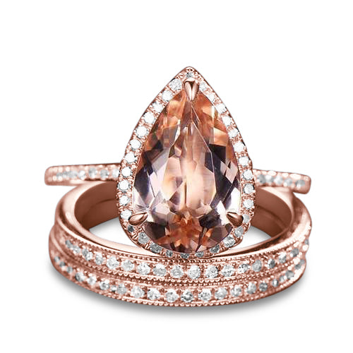 Pave 2 ct Pear Morganite Halo Trio Wedding Ring Set