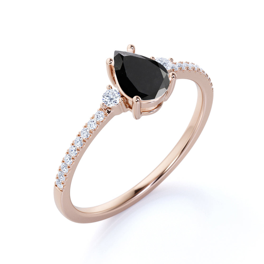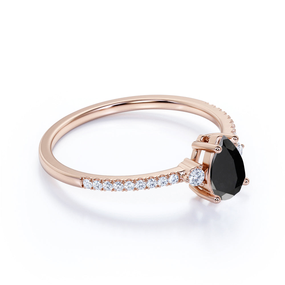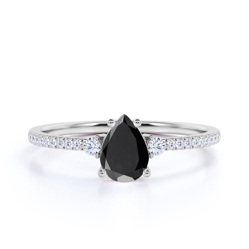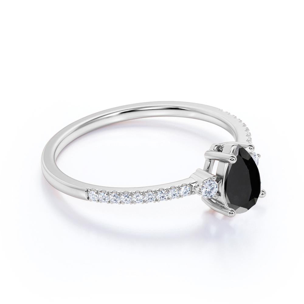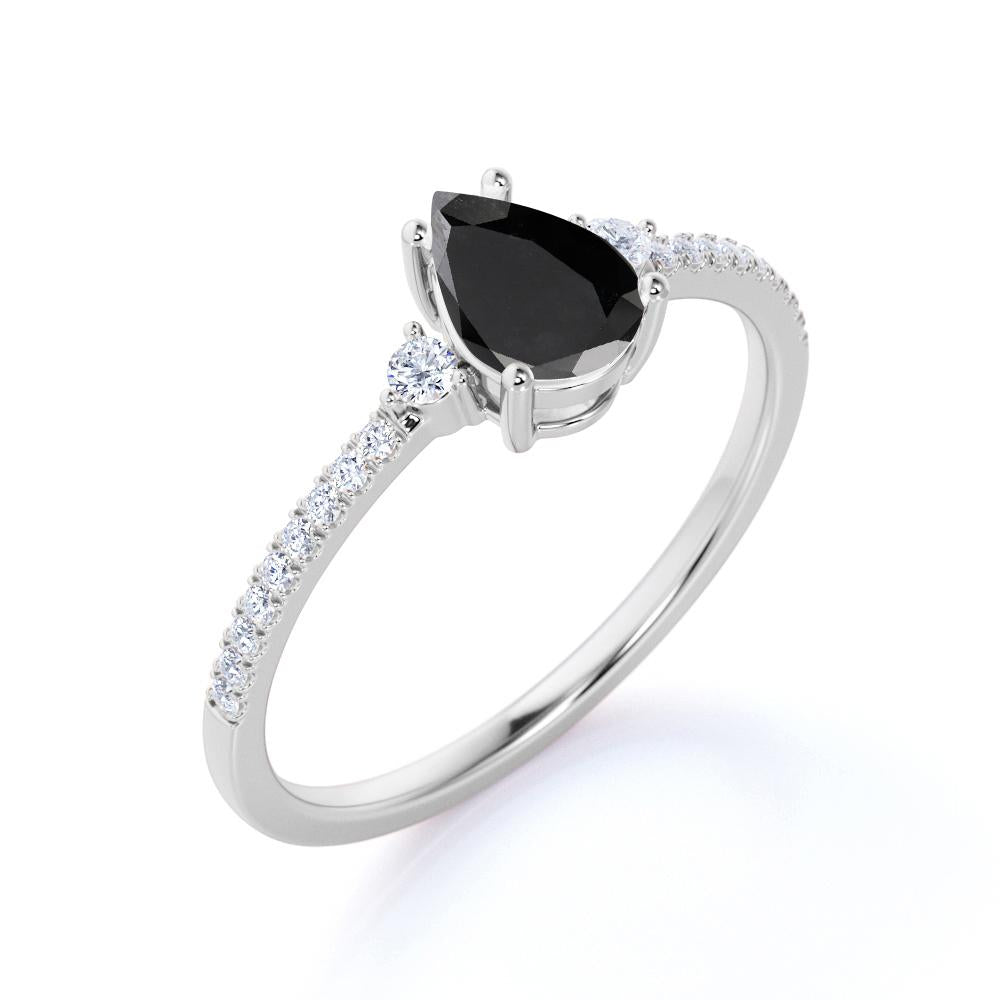 The vintage black diamond ring is quite amazing, since majority of us likes to see a vintage look, especially with an engagement ring that is absolutely beautiful. Uniqueness makes you stand out and this unique black diamond ring is perfect for you. This black diamond ring features an approximately 1 carat pear shape lab created black diamond, surrounded by .35 carat genuine side diamonds, for a total weight of 1.35 carats.
