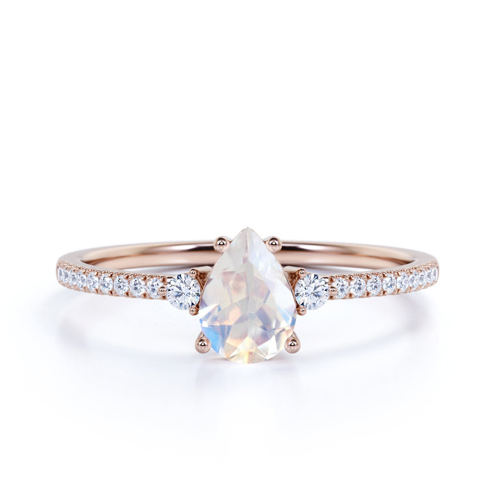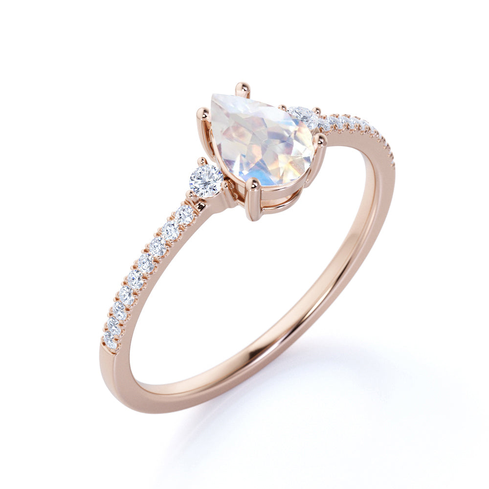 Surface Prong Set 1.50 Carat Pear White Blue Moonstone and Diamond Engagement Ring in Rose Gold