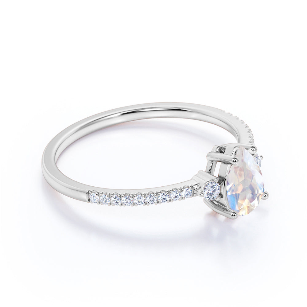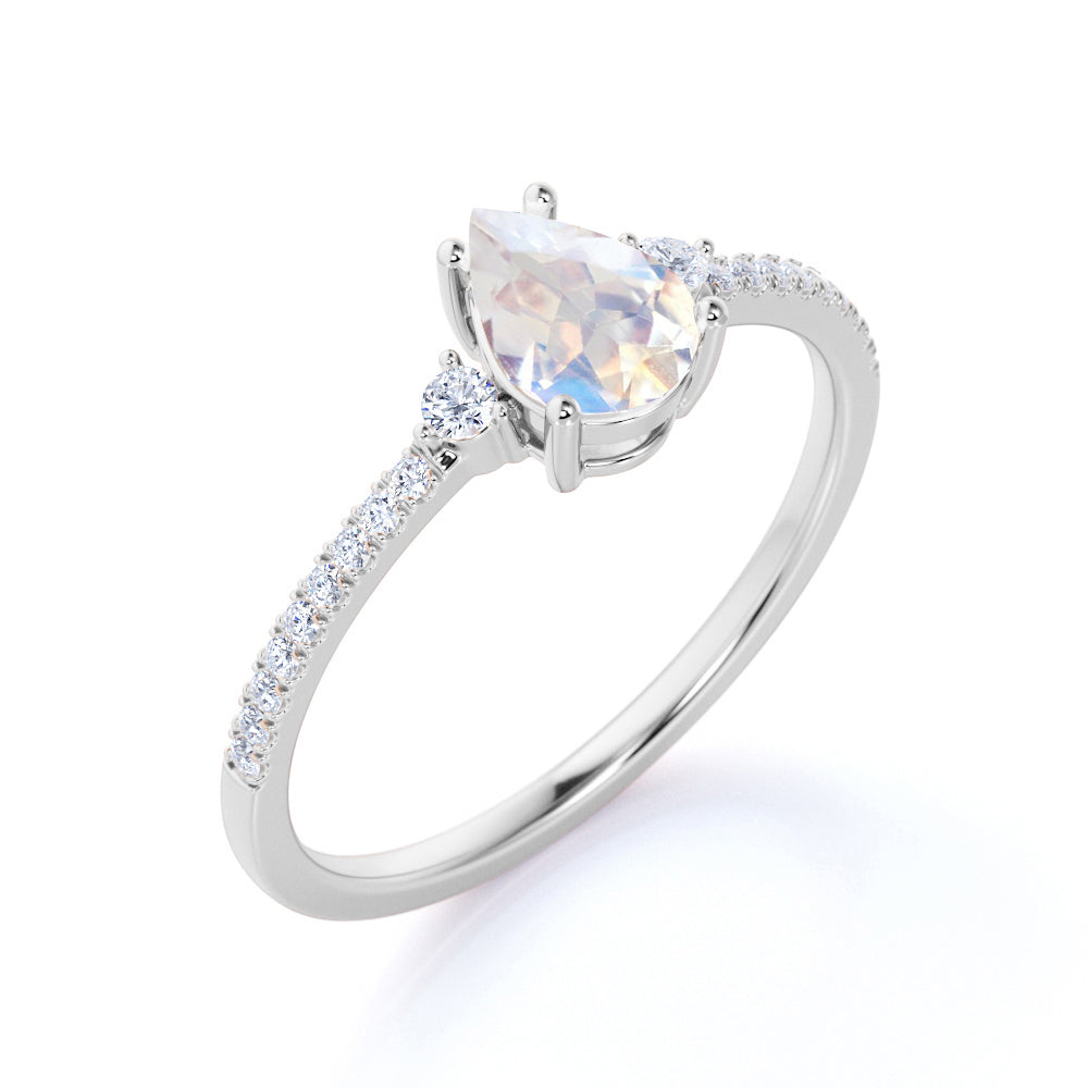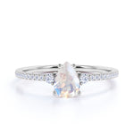 This moonstone is best for engagement ring or proposal ring. The vibrant color of this ring brings life to the fullest. The wait is over for those women who are tired of those crazy details which is not necessary for your engagement ring, this minimalist moonstone ring is the best for you. This moonstone ring features an approximately 1.25 carat pear shape natural moonstone, surrounded by .25 carat genuine side diamonds for gold ring and moissanite for silver ring, for a total weight of 1.50 carats.